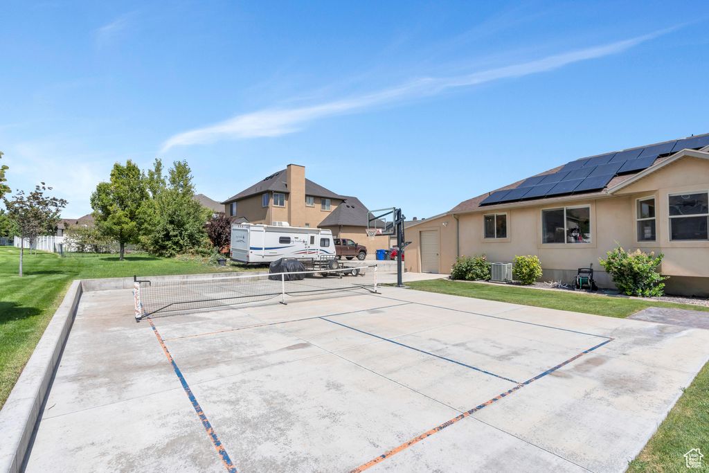 This impressive residence offers an exceptional blend of modern comfort and functional design with a built in Sonos audio system throughout the house. The open-concept main level features a gourmet kitchen equipped with top-of-the-line appliances and a spacious island, perfect for entertaining guests. High ceilings create an airy ambiance throughout the living area. The fully finished lower level is a versatile space ideal for relaxation or recreation. A dedicated home theater provides an immersive cinematic experience, while additional areas offer flexibility for a home office, gym, or playroom. Step outside to discover an oasis complete with a dedicated pickleball and basketball court, perfect for active lifestyles. The backyard, backing onto a serene green space, offers a tranquil retreat. Sustainability meets convenience with solar panels and ample parking, including dedicated RV space. Enjoy the added benefit of easy access to nearby recreational opportunities, including a picturesque lake just moments away. Square footage figures are provided as a courtesy estimate only and were obtained from county records. Buyer is advised to obtain an independent measurement.