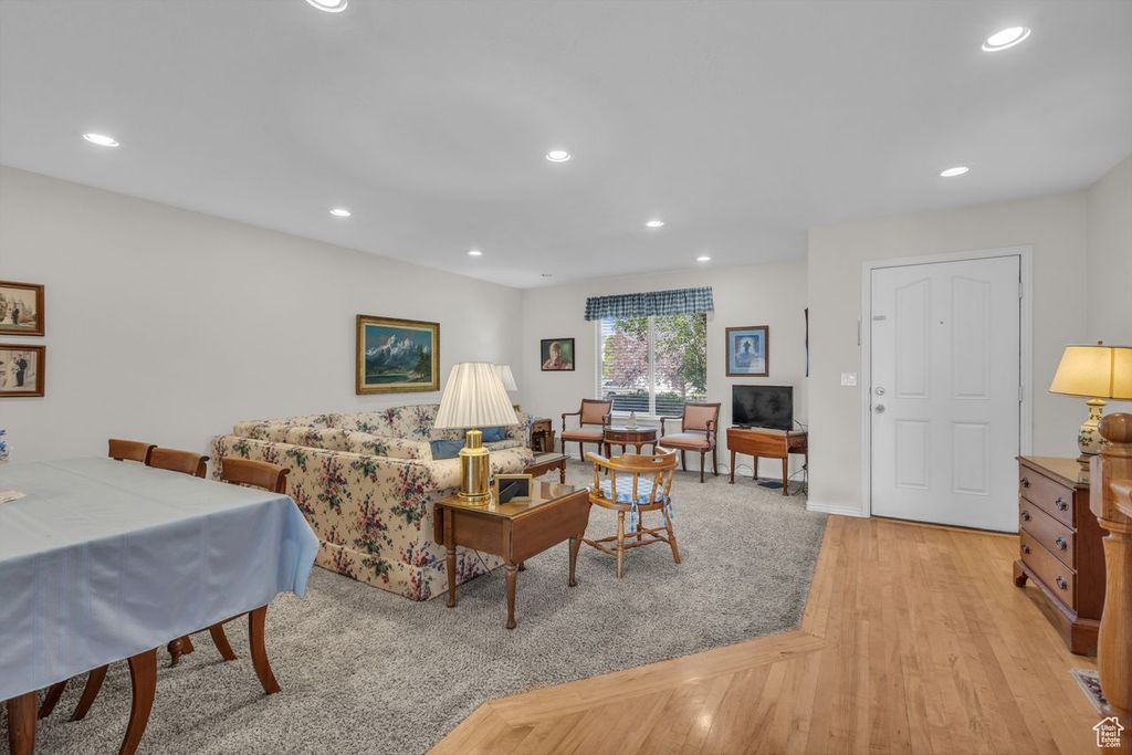 WELCOME HOME TO THIS RARE-FIND RAMBLER TWIN HOME IN HERRIMAN VILLAGE! Nestled in an established community, this charming home sits next to open space, meaning you'll never have a neighbor on the north side! Surrounded by parks and scenic walking trails, this well-cared-for property features a spacious kitchen with beautiful knotty alder cabinets, wood flooring, and a generous dining area perfect for family gatherings or entertaining guests. You'll love the large family room and formal dining area, along with recessed can lighting that brightens the kitchen and living spaces. This inviting home offers three bedrooms and two full baths, including a comfortable primary suite with its own private bath. Recent upgrades within the past two and a half years include a new furnace, A/C, water heater, garage door, dishwasher, and range-providing peace of mind for years to come. Conveniently located just minutes from Mountain View Village Shopping Center, dining, and entertainment. Don't miss your chance to own this wonderful home!