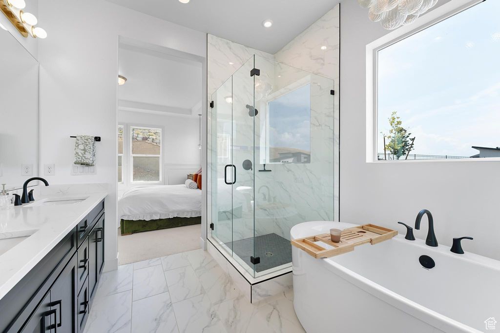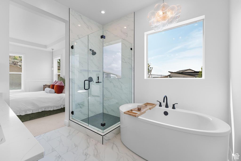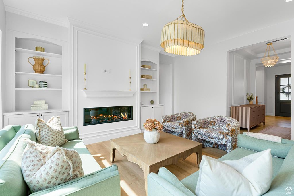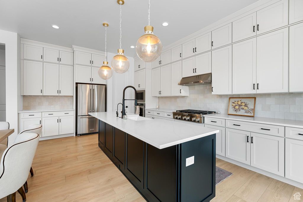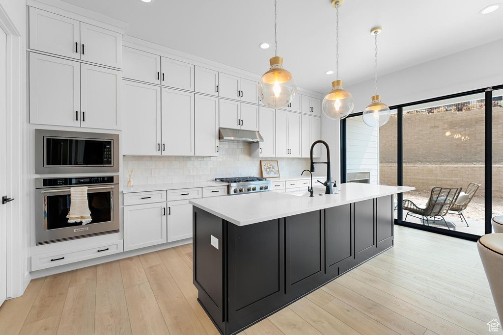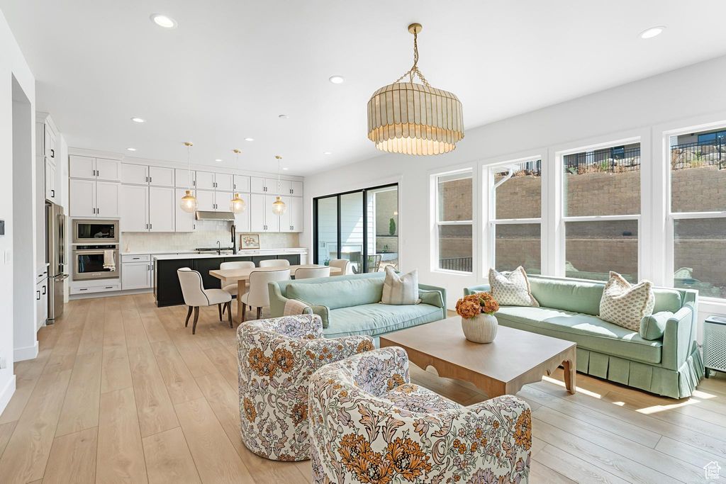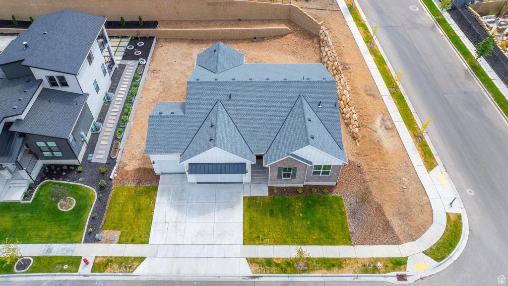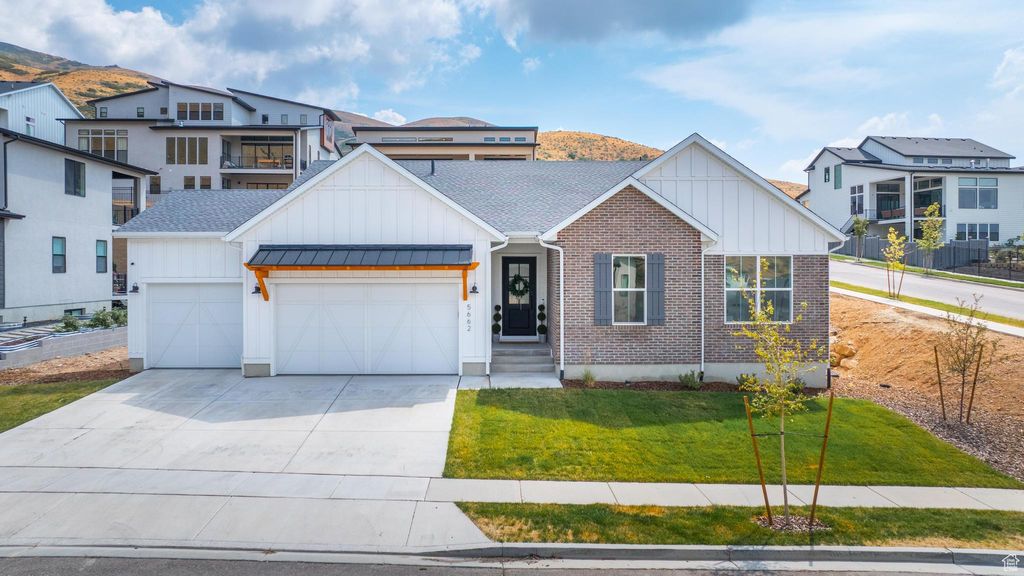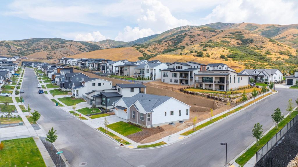 Experience modern living at its finest in this 2024 rambler, situated on a spacious corner .28 acre lot in highly sought-after Canyon Point at Traverse Mountain. Thoughtfully designed with custom details and high-end finishes, this home is move-in ready and some unique features to set it apart from the others. Step inside to find soaring 9-foot ceilings, custom wood wall accents, and designer lighting throughout the main level. The great room features built-in shelving that frames a sleek modern gas fireplace, while a stunning trifold patio door seamlessly connects indoor and outdoor living. Enjoy an expansive luxury covered patio with a gas fireplace for ambiance. The gourmet kitchen is a showpiece with huge island, KitchenAid appliances, floor-to-ceiling cabinetry, walk-in pantry, and an eye-catching backsplash. The basement is light, spacious, and designed for versatility. With two well sized bedrooms featuring walk-in closets, a second kitchen, and large family/game room, it's ideal for gatherings, guests, or multi-generational living. There's even dedicated spacel to create your own home gym or theater. Additional upgrades include dual tankless water heaters, a water softener, over $5k in security system enhancements, and a beautifully designed layout with both style and functionality in mind.