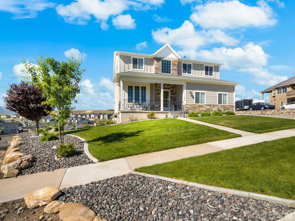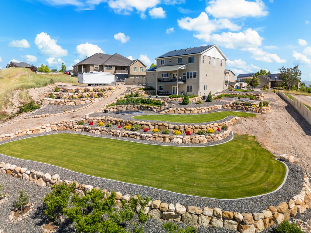 PREFERRED LENDER OFFERING RATE BUY DOWN Welcome to this spacious, move-in ready home where quality meets comfort. Thoughtfully designed for everyday living and exceptional entertaining, it offers panoramic mountain views from the covered deck and expansive back patio. Crafted with quality 2x6 construction, this home features living spaces on every level and an ADU in the fully finished basement-ideal for multigenerational living, guests, or rental income. Enjoy a chef's dream kitchen with a large island, professional-grade fridge and freezer, double ovens, quartz countertops, and an oversized walk-in pantry. Outdoor enthusiasts will love the 3-car garage, massive RV parking with 220V hookups, and room to add a shop. The landscaped, terraced yard includes raised garden beds, mature fruit trees, berry bushes, and an in-ground trampoline-a true backyard paradise. Hot tub hookups are ready to go, and the owned, top-tier solar panel system delivers energy efficiency and long-term savings. Why build new when you can have it all-space, flexibility, and incredible views-without the wait or extra cost? This is Utah living at its best. Square footage figures are provided as a courtesy estimate only buyer is advised to obtain an independent measurement.