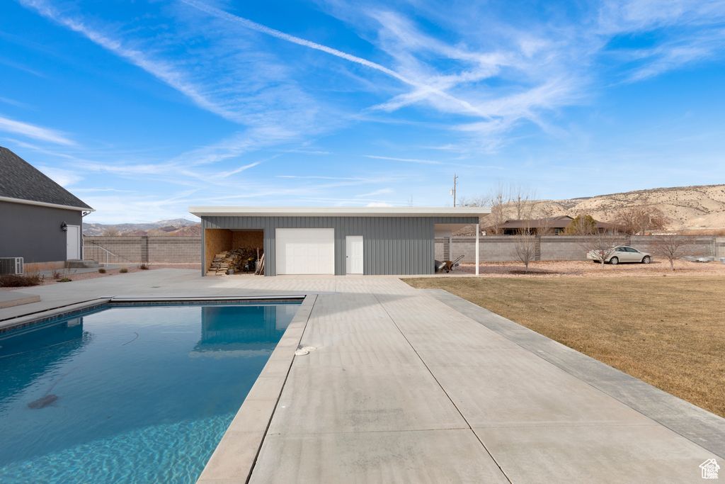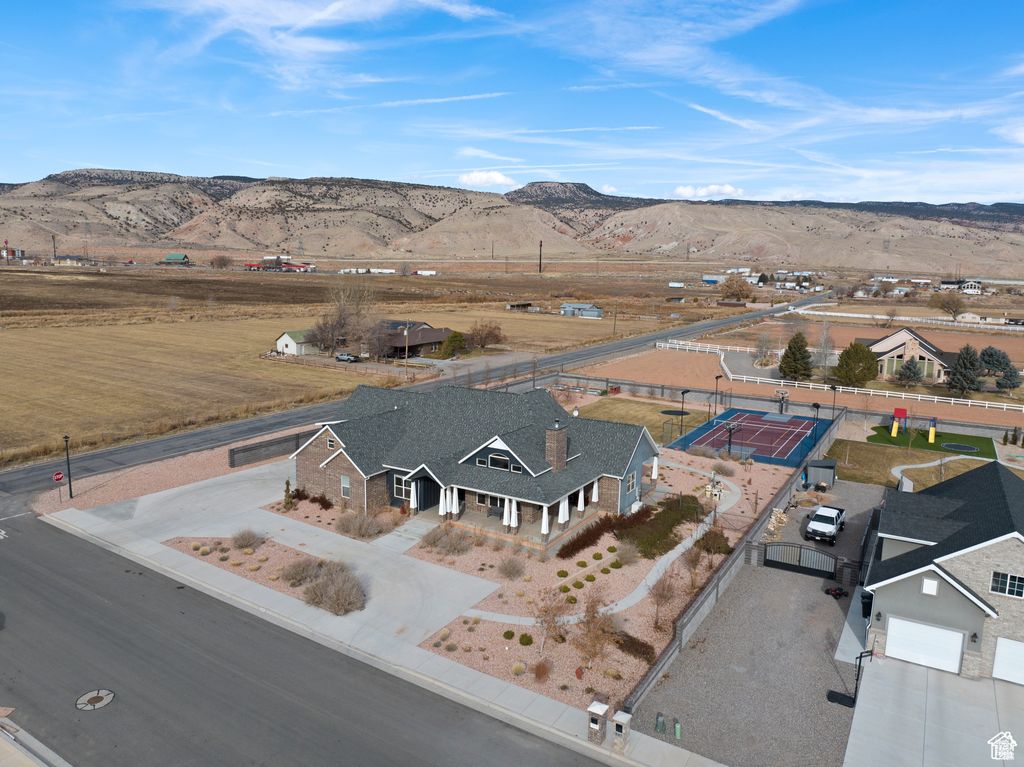 This thoughtfully designed home boasts soaring ceilings, oversized windows that bathe the interior in natural light, and an open layout perfect for everyday living or entertaining. The stunning kitchen features granite countertops, rich cabinetry, and a spacious island, creating a warm and modern heart of the home. Step outside to a fully loaded backyard retreat where you'll find an in-ground pool, bubbling hot tub, and a full-size sport court-all set against a backdrop of open skies and scenic mountain views. A spacious 3-car garage with durable epoxy-coated floors offers plenty of room for vehicles and storage. Located in a peaceful, well-kept neighborhood.