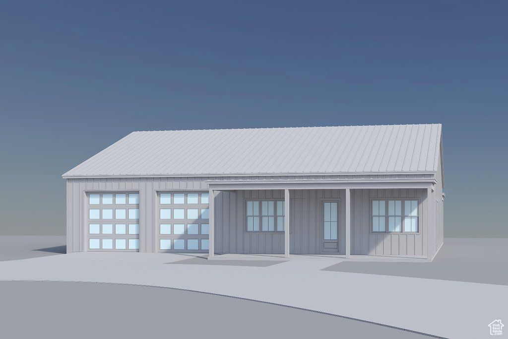This barndominium blends modern comfort with simple charm, designed for both everyday living and entertaining. It features two bedrooms, two full baths, an oversized garage, and a laundry room. The heart of the home is an open-concept living, dining, and kitchen area with 12-foot ceilings, an electric fireplace, and large windows that open to spacious front and rear porches-ideal for gatherings or relaxing outdoors. The kitchen includes a central island for casual dining, while the main suite offers a walk-in closet and a custom shower in the en suite bath. Option to add a basement! This floor plan can be customized!