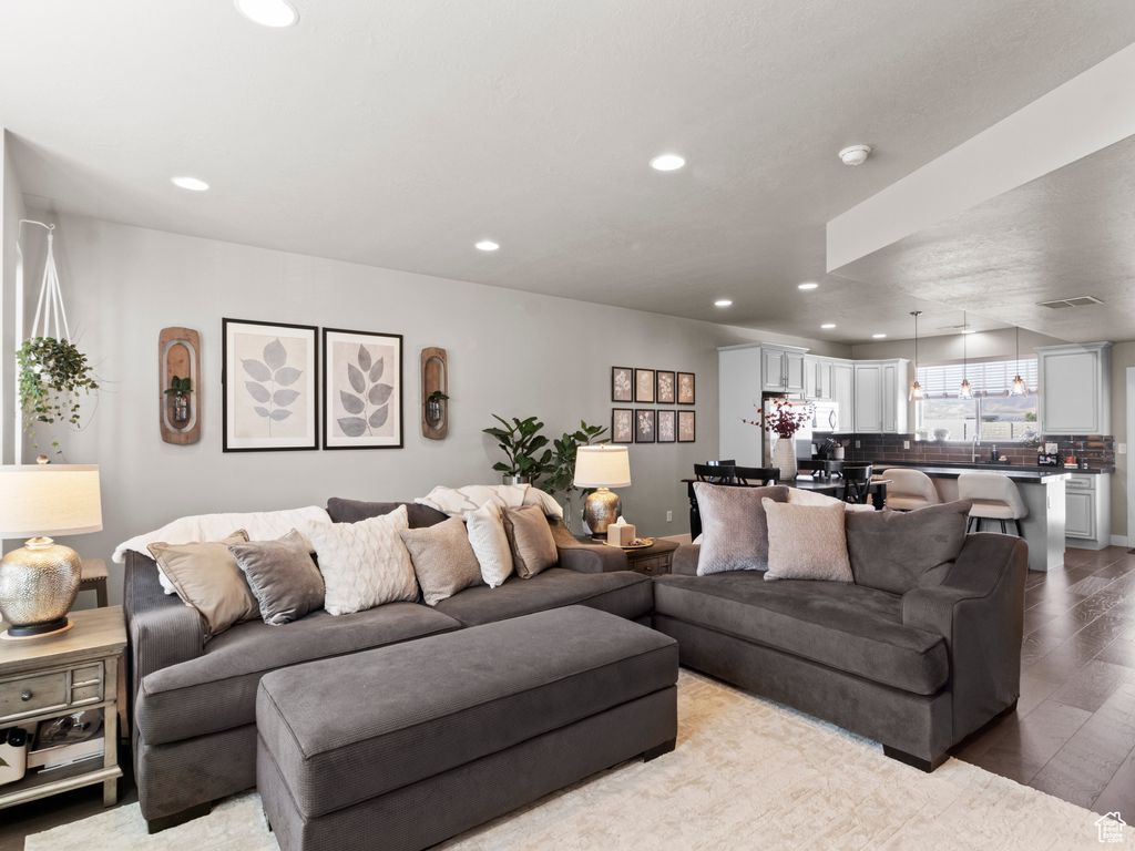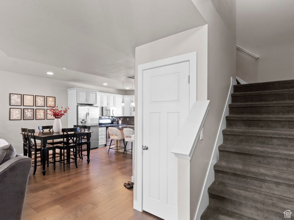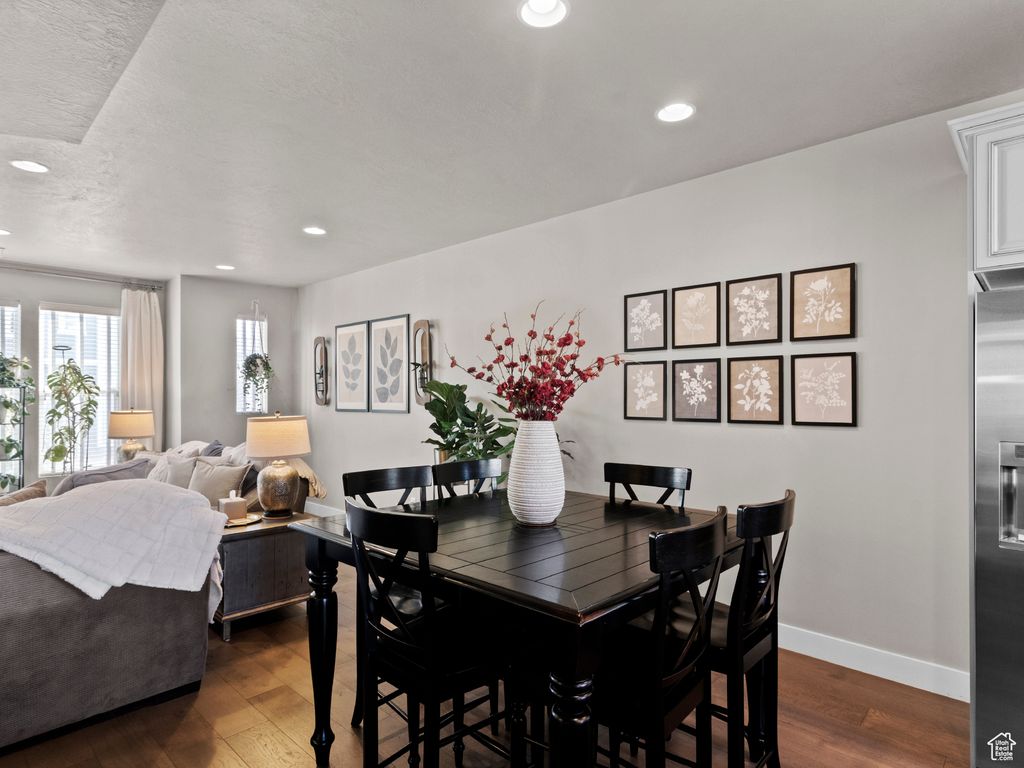 Located in Draper's premier Creekside neighborhood, this immaculate townhome showcases quality construction, high-end finishes, and a location that's hard to beat. Inside, you'll find granite countertops, custom cabinetry, high-end flooring, and recessed lighting throughout. The open main level is designed for entertaining, with a layout that feels bright, modern, and functional. Upstairs, the primary suite includes dual vanities, a walk-in closet, and plenty of space for a King bed. Step onto the balcony for valley views and evening sunsets, or enjoy quiet evenings on the private patio and fenced backyard with direct access to the neighborhood park. Just minutes from Corner Canyon trails, shopping, groceries, dining, and top-rated schools. Meticulously maintained and move-in ready, this home offers the ideal balance of quality, style, and location.