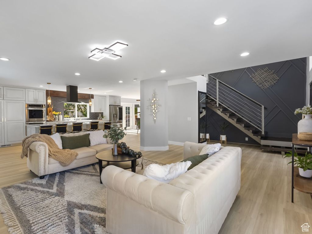 Fall in love with this gorgeous, remodeled home offering endless upgrades and a walk-out basement. As you walk in, the elegant wood staircase really sets the tone. Enjoy an open floor plan with LVP flooring, two cozy electric fireplaces. The chef's kitchen features quartz countertops, double ovens, a microwave drawer, custom cabinetry and abundant storage. This space is designed for everyday living and gourmet entertaining. You'll love the two primary suites-one with a private bath and walk-in closet, and the main suite offering vaulted ceilings, a spa-inspired ensuite with soaking tub and separate shower, a large custom closet, and a stunning sunroom. The finished walk out basement adds a theater room ready for movie nights or game days. You will also find three bedrooms, two bathrooms, and a large living area, perfect for gatherings or rental potential. Outside, enjoy the spacious pavilion with grill area, built-in fire pit, sports court, in-ground trampoline, and RV parking. It is located around the corner from the elementary, two blocks from the middle school, and walking distance to the high school. With a new roof, 2 newer HVACs, newer water heater, and a prime location, this home has it all! Square footage figures are provided as a courtesy estimate only and were obtained from an appraisal. Buyer is advised to obtain an independent measurement. Agent Owner.