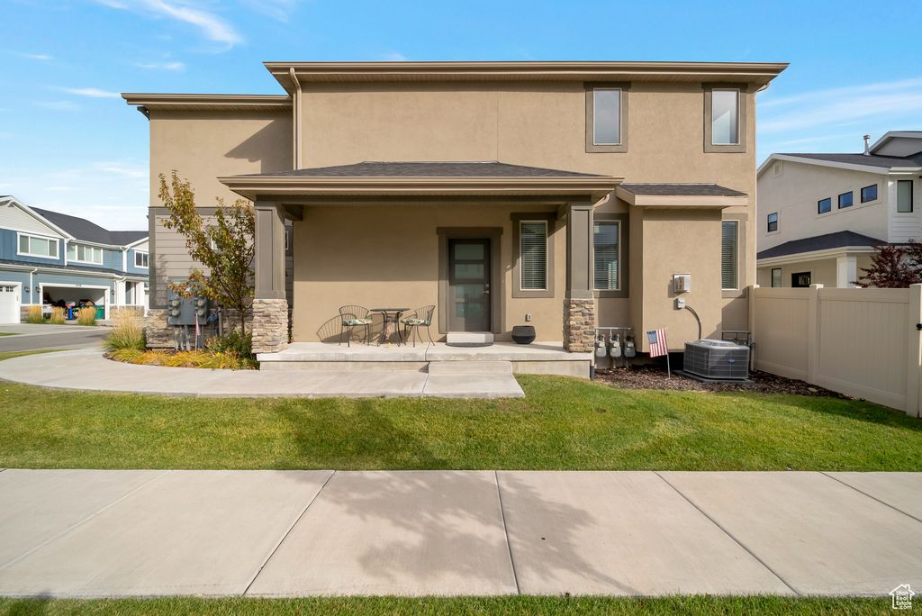 WELCOME to your CHARMING DREAM HOME* This one has it all* MOVE IN READY* Nestled in the coveted Porters Point Subdivision* END UNIT* Beautifully designed with tons of upgrades* 9ft ceilings on the main floor with OPEN TO BELOW over the familyroom reaching the second floor* Cozy beautifully designed fireplace with a spacious open to below familyroom* Gorgeous silver railing* Beautiful kitchen with tall upgraded cabinets with a stunning backsplash* Large inviting island with white quartz countertops* Stainless GAS STOVE and DOUBLE OVEN and upgraded appliances including the refrigerator* 2-tone paint* Basement unfinished with room to grow including a future bedroom, full bath, and familyroom* Upstairs features large primary bedroom with a full shower/garden tub and dual sinks in the primary bath* Fun Barndoor opening * VAULTS throught out the upstairs* Laundry upstairs including WASHER and DRYER* Outside in the back enjoy your private fenced patio while relaxing in your soothing hot tub that is included* Great Bluffdale location close to parks, top rated schools, shopping, and access roads* HURRY for this one*