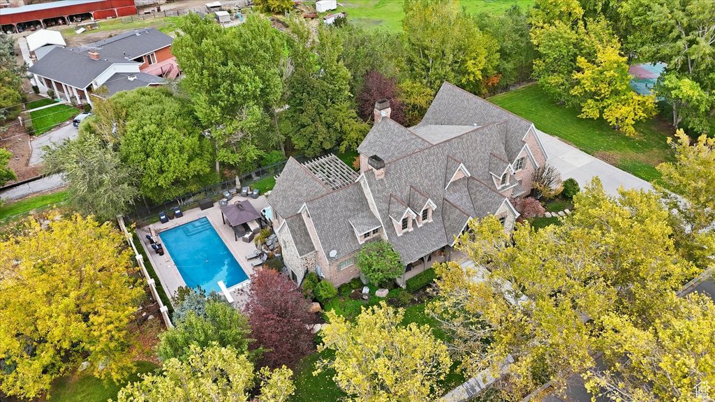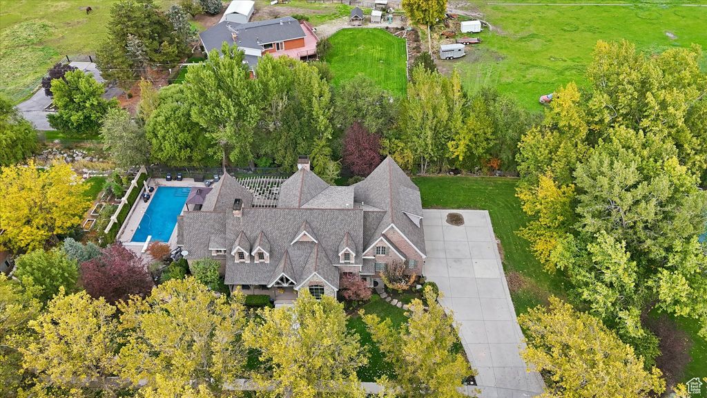 Nestled on one of Draper's most enchanting tree-lined canopy streets, this extraordinary estate sits on a private 0.61-acre lot-the crown jewel of the neighborhood. The hand-crafted brick and real stone exterior, solid Brazilian cherry wood flooring, Marvin wood-clad windows, and exquisite architectural details exemplify timeless, curated craftsmanship. The open-concept design features a two-story great room with a 30-foot real stone fireplace and wood-beamed ceiling. The gourmet kitchen offers informal dining, granite countertops, a new Thermador range, hood, and oven, plus a walk-through butler's pantry leading to a formal dining room. A spacious theater room on the lower level adjoins a kitchen, ideal for entertaining. The home offers unmatched flexibility with seven bedrooms, including four en-suite baths, two main-floor powder baths, three family rooms, a large craft/wrapping room, three storage rooms, and a private multi-desk office with built-ins. The main-level primary suite features an en-suite bath, a large walk-in closet with built-ins, and an island with locking jewelry drawers. French doors open to private, shaded outdoor dining and a serene backyard with a spa-like retreat. Additional features include solid wood four-inch shutters, three fireplaces, three air conditioners, and four furnaces that maintain consistent temperatures, an ADT security system, and nine-foot basement ceilings. The heated four-car garage includes two EV outlet plugs. Six French doors open to the backyard, allowing you to enjoy seamless indoor-outdoor living. Main-floor and lower-level laundry rooms offer added convenience. The backyard provides privacy with an eleven-foot-deep saltwater pool, a peaceful babbling stream, and shaded dining under a pergola with views of a five-acre ranch filled with horses and wildlife. Two water shares offer secondary water to complete this exceptional property. This estate offers a lifestyle of elegance, comfort, and natural beauty in one of Draper's most coveted neighborhoods.. Square footage figures are provided as a courtesy estimate only and were obtained from County Records. Buyer is advised to obtain an independent measurement.