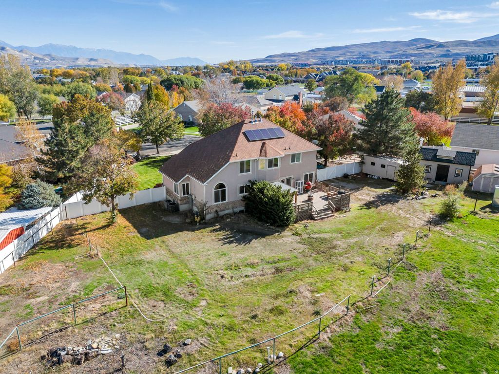 Beautifully located two story home on a full acre in one of Bluffdale's most desirable neighborhoods. Perfectly situated near the Riverton and Herriman borders, this property offers the perfect balance of convenience and privacy. Step inside the elegant foyer and into the open living area with tall ceilings. The kitchen features a breakfast bar and flows seamlessly into the second living space, ideal for entertaining. The spacious primary suite includes large windows, a walk in closet, and an ensuite bathroom with dual sinks, a soaking tub, and a separate shower. The basement offers great potential for an ADU or apartment-just add a kitchen and walkout on the south side. Major updates include new furnaces and AC units, new refrigerator, dishwasher, washer, dryer, and water heater. Paid off solar panels provide excellent energy savings. Enjoy mountain views, a full acre of horse property, and quick access to Bangerter Highway. Don't miss this rare Bluffdale gem! Measurements provided as a courtesy only, buyer to verify all info.