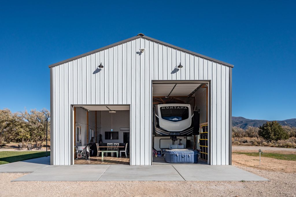 Check out this rare property! Having off grid features but still close to town, featuring a LARGE building lot of 2.34 acres with dozens of mature trees, and the added bonus of the fully insulated heated and cooled detached garage including a 1 bedroom/office, 16' tall ceilings, pull through double garage doors with openings of 14 X 10' and a single door opening of 10 X 10', garage capacity of up to 5 cars, laundry unit inside and so much more! Ideal situation could be to live in the garage space while building a home on the large 2.34-acre lot with many of the needed building improvements already in place for your future home! No CC&R and no HOA. The garage has full RV hookups. Both the Connex container and the garage already have an upgraded solar system. The property is on a shared well that only shares with 1 neighbor. Located at the end of the street, it will remain quiet and peaceful with-it bordering farms and acreage on the north and east property lines. This is a one-of-a-kind property that won't last, don't delay come see today!
