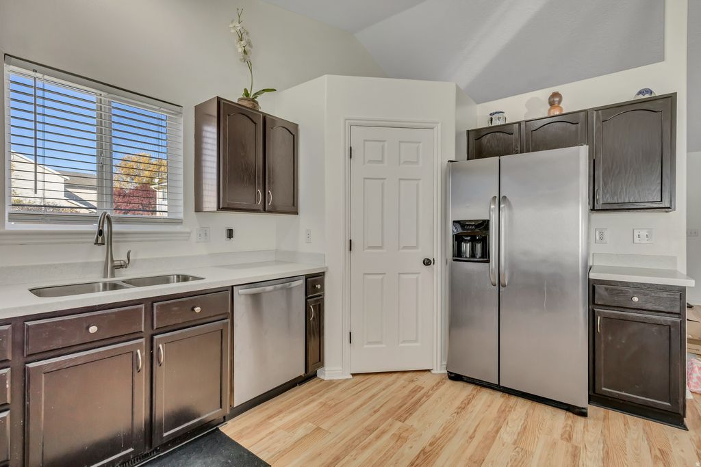 This inviting two-story home features a bright, open floor plan with vaulted ceilings and abundant natural light. The updated kitchen boasts solid surface countertops, a spacious breakfast bar, and ample cabinet space. Recent improvements include new carpet throughout, stylish new light fixtures, and a finished basement bedroom-ideal for guests, a home office, or additional living space. The basement also offers a large cold storage room with built-in shelving and a newer water softener. Outside, enjoy a fully fenced and landscaped yard with mature trees, two grow boxes, a garden area, and a convenient storage shed. Nestled in a quiet cul-de-sac just minutes from schools, parks, shopping, and paved walking trails. Square footage figures are provided as a courtesy estimate only; buyer to verify.