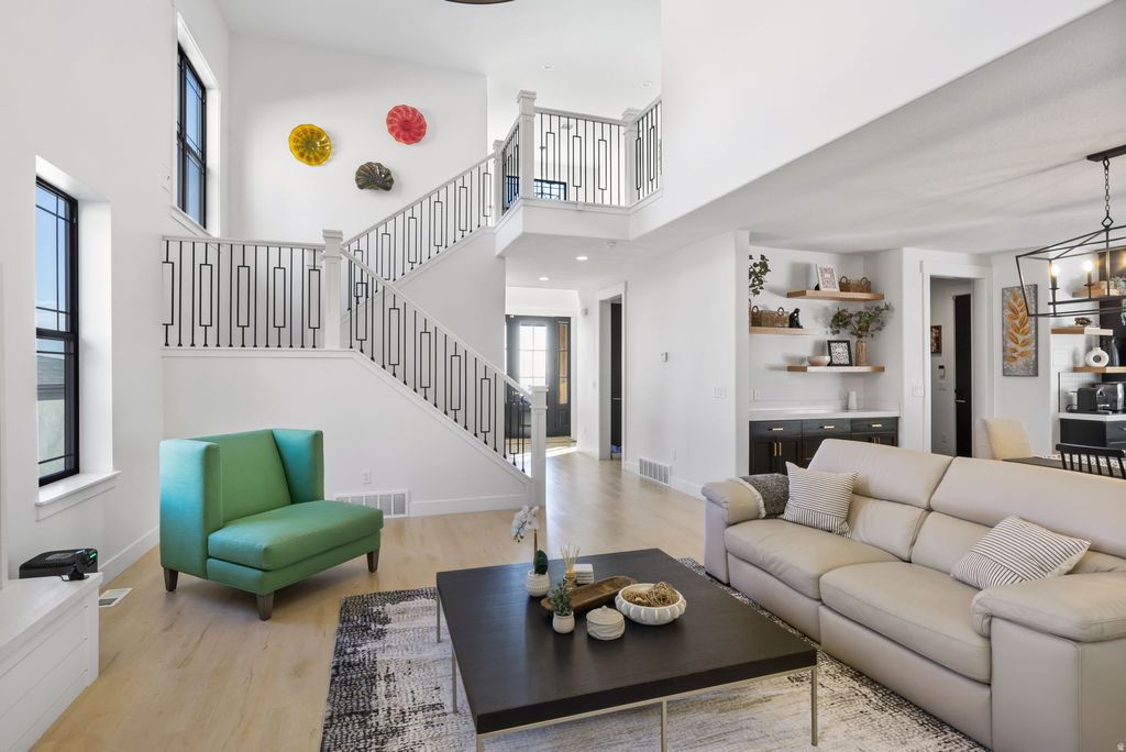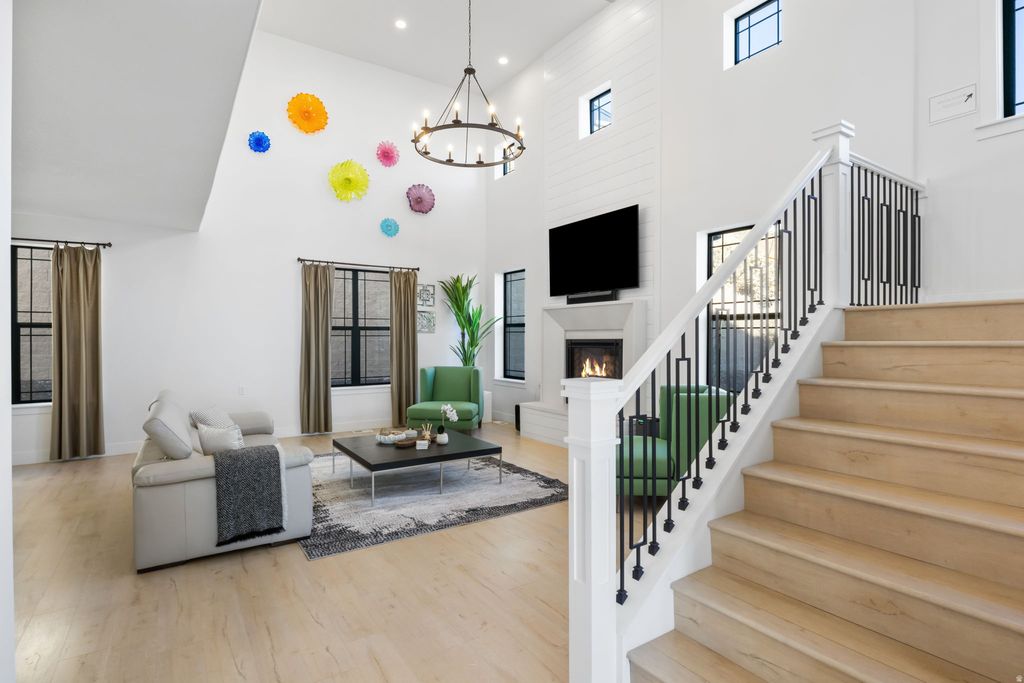Perfection! This thoughtfully designed modern home blends timeless style with everyday convenience, featuring 18' ceilings, custom finishes, and an open concept floorplan. Inside, you'll find a stunning statement fireplace with floor-to-ceiling shiplap, quartz countertops, durable LVP flooring, and soft-close two-tone cabinetry. The kitchen is equipped with premium KitchenAid appliances, a custom range hood, open shelving and ample storage. Upstairs, the primary suite is your private retreat with a spa-style bath, custom closet, and a balcony showcasing mountain and incredible valley and lake views. The finished basement offers a fitness room, surround sound system, and flexible living space for work or play. Step outside to your private oasis-designed for low maintenance and maximum relaxation. Enjoy a built-in BBQ area, and thoughtfully designed landscaping that gives you all the beauty with none of the weekend yard work. Perfect for the busy homeowner who wants to unwind, entertain, or simply enjoy peaceful evenings outdoors. Home comes equipped with smart lighting and exterior Christmas light outlet with timers! Schedule your private showing today and experience effortless luxury living.