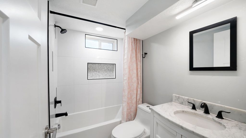 Recently updated and move-in ready! This spacious home offers modern comfort and flexible living. The upstairs living room features a cozy fireplace, perfect for relaxing or entertaining. Enjoy beautifully remodeled bathrooms with custom tile showers and a private en suite bedroom with a full bath. The main floor includes two bedrooms, while the finished basement adds three additional bedrooms, a stylish updated bathroom, and a comfortable living room, ideal for guests, family, or a home office setup. The backyard is a blank canvas ready for your personal touch next spring, whether you envision a garden, patio, or play area. Convenient attached garage with storage, plus carport and driveway parking. Remodeled in 2021, this home blends modern updates with functional design in a great location! Assumable loan at 2.875%.