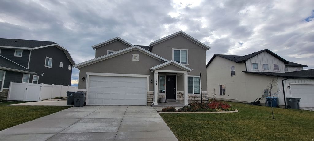 Built in 2023, this stunning 1,999 sq ft two-story home combines modern design with an unbeatable location and forever-protected views of Utah Lake and the surrounding mountains. Perfectly positioned in a quiet, family-friendly neighborhood in American Fork, you'll enjoy breathtaking, unobstructed lake and valley vistas that can never be built out. Step inside to an open-concept main floor flooded with natural light. The heart of the home is the sleek modern kitchen featuring crisp white shaker cabinetry, expansive quartz countertops, a large center island with seating, stainless steel appliances-ideal for both everyday living and entertaining. Upstairs, convenience meets comfort: all bedrooms are thoughtfully placed on the same level, with the laundry room located just steps away-no more carrying baskets up and down stairs. The spacious primary suite offers lake views, a luxurious en-suite bath with dual vanities, quartz counters, and a generous walk-in closet.