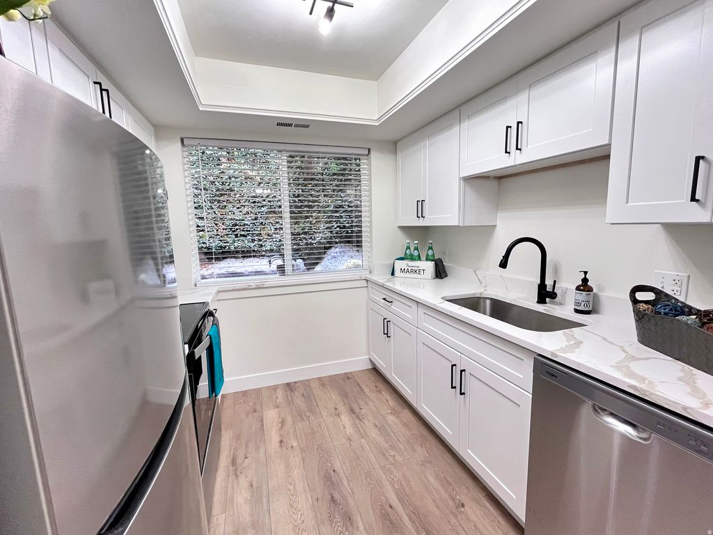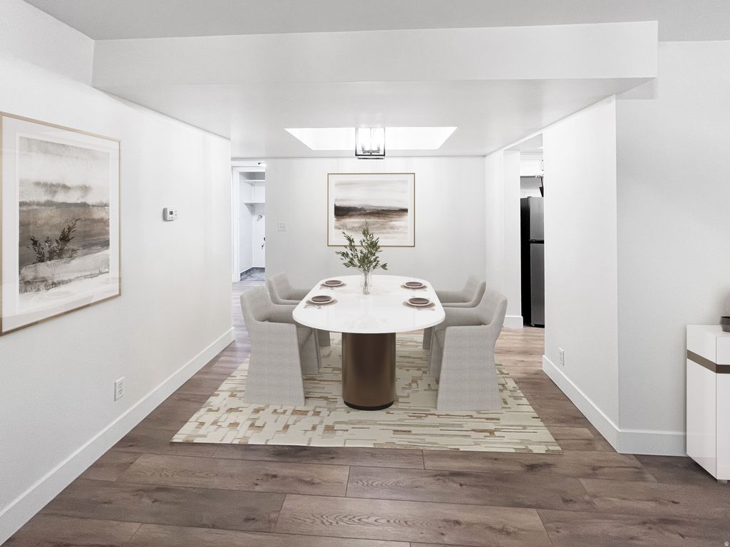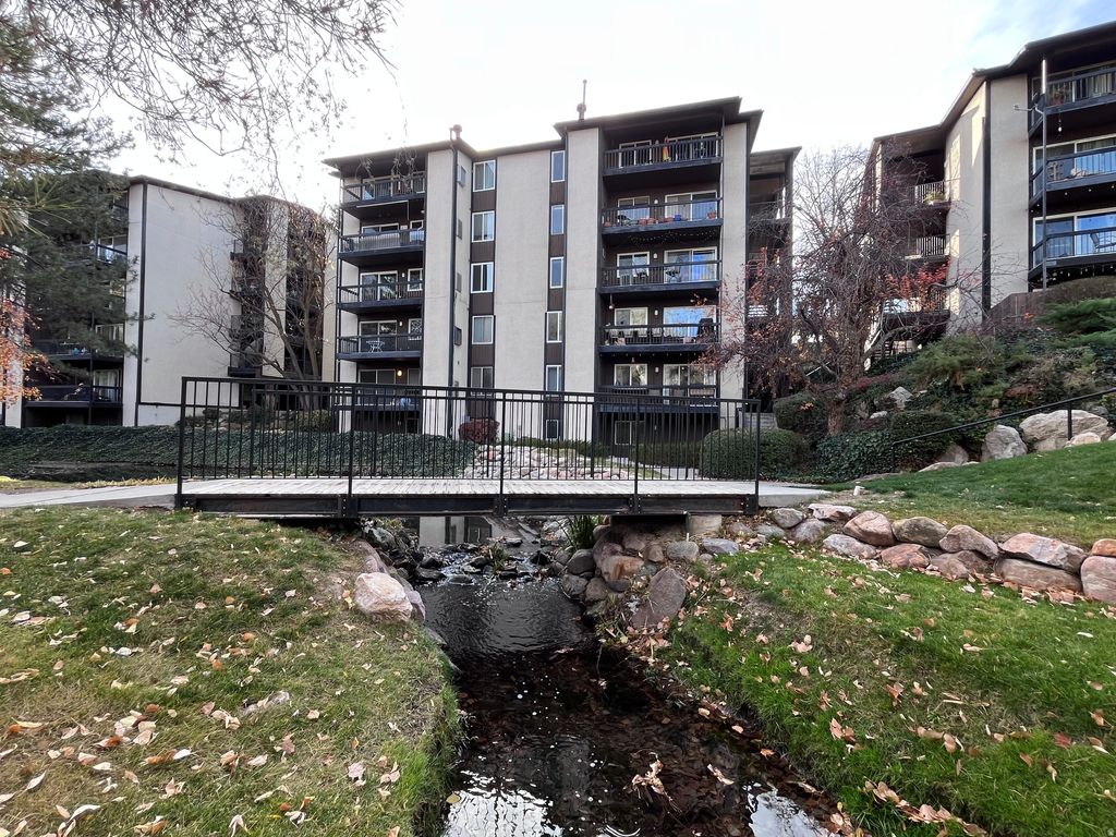 Beautifully renovated and turnkey, this stunning condo in the highly sought-after Three Fountains community combines comfort, style, and convenience. Updated throughout with quartz countertops, new stainless appliances, new lush carpet in the bedrooms and luxury laminate plank flooring, the home offers warm tones, and thoughtful finishes at every turn. The spacious living area opens to a large covered private patio offering an ideal spot to unwind in privacy. The building overlooks serene, wooded views, towering mountains, and a quiet flowing stream frequented by ducks and birds. The expansive primary suite features generous closet space, a sprawling double sink vanity, and a stunning glass-enclosed shower. A second updated bathroom showcases additional custom finishes. Included is your private laundry area offering additional storage space. A secure oversized storage room sits just below the unit, perfect for seasonal items and gear. Three Fountains residents enjoy access to well-kept amenities including a pool, tennis courts, walking paths, ponds, and beautifully landscaped grounds. Gas is included in the HOA payment, making one less utility to worry about. Ideally positioned between Murray and Holladay, the home is minutes from popular dining and shopping. A rare find in a beloved community-don't miss this stunning condo.