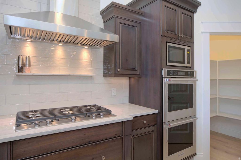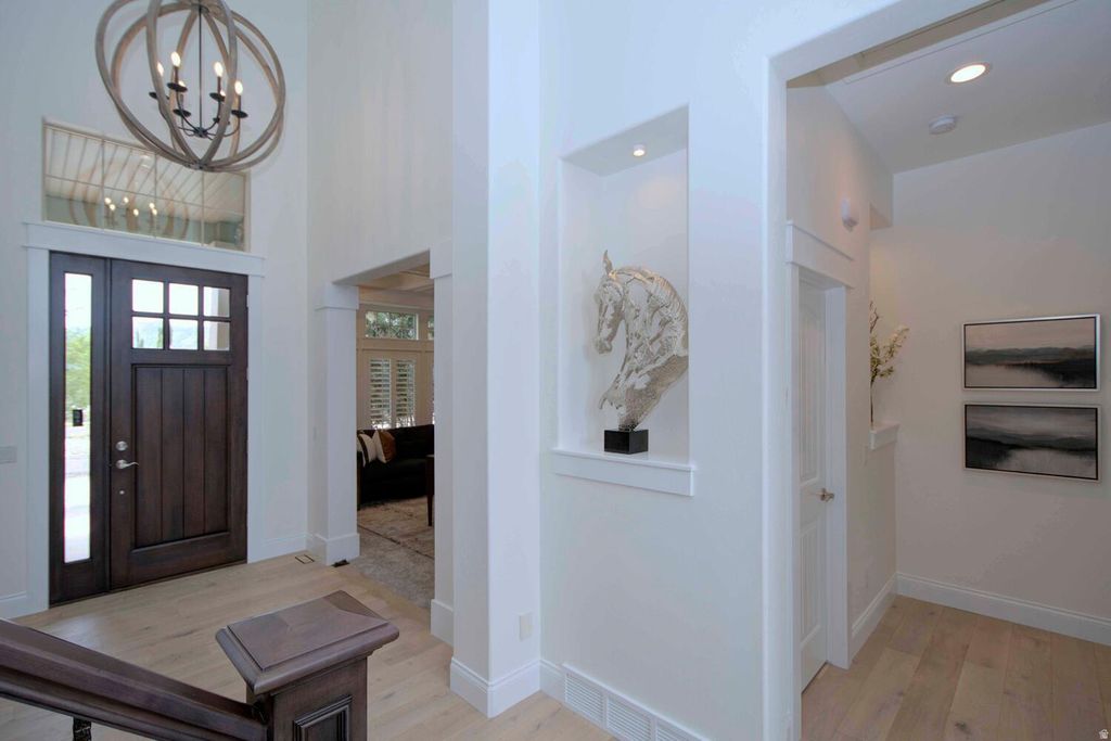 Home is occupied. Must have an appointment to view. Exquisite Riverton Estate: Within walking distance of Mountain View Village-movie theater, dining, shopping, and more. Luxury and Functionality Combined. Step into perfection with this meticulously updated and expansive Riverton home, boasting over 5,300 square feet of living space. With 6 spacious bedrooms, 4 bathrooms, 2 kitchens, and 2 laundry rooms. Every detail of this residence has been thoughtfully considered and impeccably updated. Upon entry, the foyer welcomes you with updated lighting which continues throughout. A formal living room and a home office overlook the tranquil cul-de-sac setting, offering both privacy and convenience. The heart of the home unfolds in the family room, where a dramatic two-story vaulted ceiling invites ample natural light through large windows. The kitchen and laundry rooms showcase exotic quartzite countertops, hardwood flooring and state of the art appliances, ensuring both beauty and functionality. Step out onto the expansive covered deck from this level and marvel at the sprawling 1 plus acre yard, a serene retreat perfect for gathering and relaxation. The main level features the master suite offering privacy and luxury while upstairs boasts 3 additional bedrooms and an oversized loft. The basement level provides an additional living space with a full kitchen, laundry room, workout room, 2 additional bedrooms, 1 bathroom, and built-in vault, all beautifully updated and accessible via a walkout to a covered patio and a separate entrance through the garage this could provide additional rental income. Outside, the private backyard is a true oasis, complete with an all season water feature, a gas fire pit, and a sprawling playground area- perfect for outdoor enjoyment year round. Car enthusiasts and hobbyists will appreciate the oversized 4-car attached garage and a separate heated garage with room for 6 additional cars and an RV measuring 60' by 40'. The detached garage includes a half bath and a spacious unfinished upstairs area with roughed-in plumbing offering potential for future expansion and additional living space . Additional parking space behind the garage ensures ample room for all your recreational vehicles and trailers. This exceptional property is a rare find, combining luxury, functionality, and endless possibilities. Contact the listing agent today to schedule your private showing and experience firsthand the multitude of features this Riverton estate has to offer.