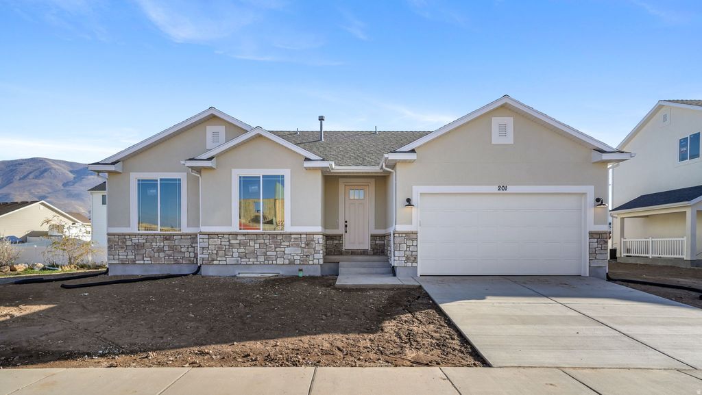 Welcome to your dream home! This brand new custom rambler is perfectly situated in one of Santaquin's most desirable neighborhoods, on a quiet street with breathtaking mountain views. Enjoy luxury main floor living with high end finishes, including sleek black hardware, 8 foot doors, and a gourmet kitchen designed for both style and function. The covered walk out basement comes pre-plumbed for a mother in law suite or ADU, offering incredible potential for extra living space or rental income. Experience true small town charm, excellent schools, and quick access to I15 for an easy commute. Fall in love with this exceptional home, schedule your private tour today! Zero down financing available in this area!