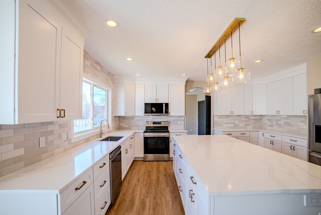 Beautifully remodeled home nestled in a quiet Riverton neighborhood. Step inside to soaring ceilings in the entry and front living room, highlighted by oversized windows that fill the space with natural light. Enjoy new flooring and designer lighting throughout. The gourmet kitchen features a large island, quartz countertops, custom backsplash, stainless steel appliances, and an inviting eat-in area with a bay window. The main floor includes a versatile bedroom perfect for guests or a home office, paired with a nearby full bathroom for added convenience. The luxurious master suite offers a cozy sitting room with its own gas fireplace, a spa-like ensuite with a freestanding soaking tub, an oversized walk-in shower with tile surround, and a spacious walk-in closet with custom built-ins. Additional upgrades include black interior doors, modern black hardware, updated hand railing, tray ceilings, and built-ins throughout. The fully finished basement features a mother-in-law apartment with its own separate entrance, full kitchen, and newer cabinets and appliances. Outside, enjoy a large fenced backyard complete with a fire pit area, covered patio, and plenty of space for a garden. 1% PREFERRED LENDER INCENTIVE AVAILABLE!