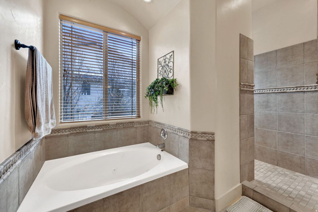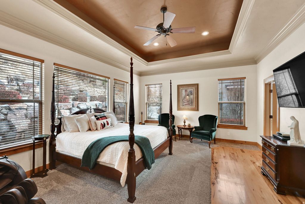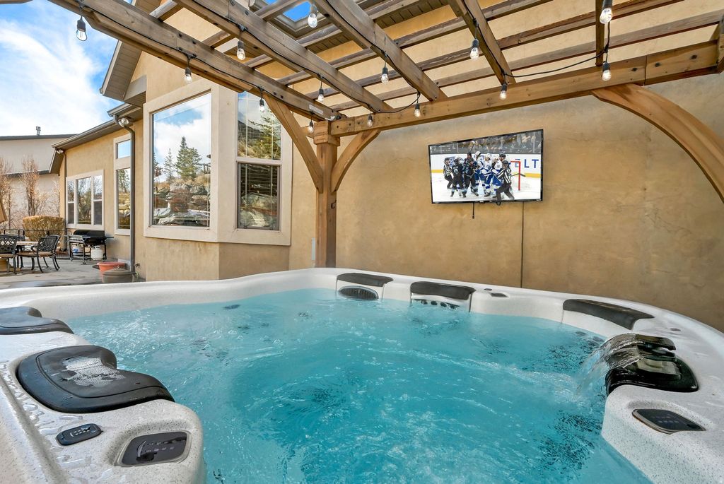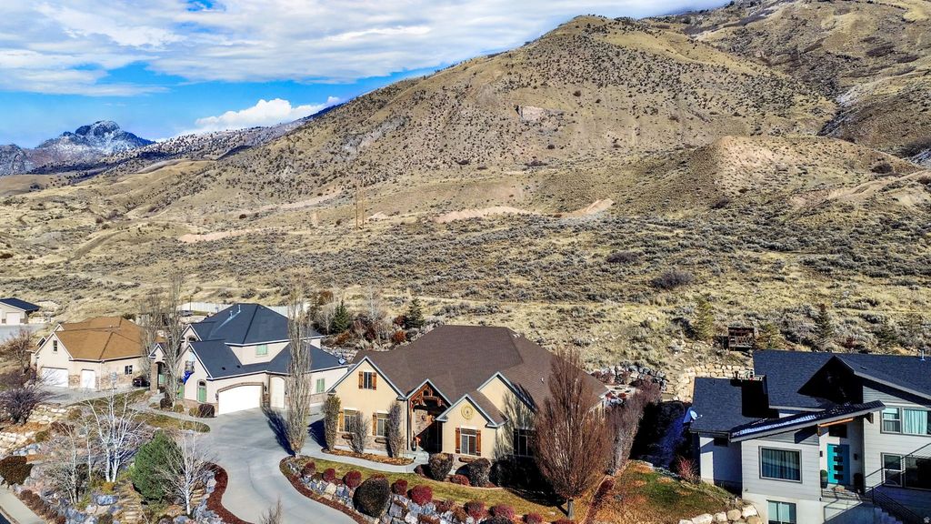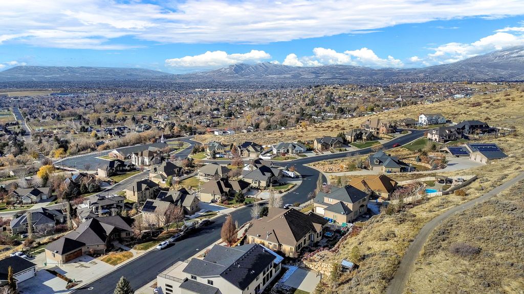 Beautiful 5,600+ sq. ft. rambler with an open floor plan, main-floor primary suite, and a large upstairs bonus room. The kitchen features granite countertops and a large island, opening to a spacious living room with a fireplace. The fully finished basement offers a dance studio, media/family room, game room, two bedrooms, and a full bath. Outside, enjoy sweeping mountain, lake, temple, and valley views. Backyard equipped with a hot tub, pergola, and mounted TV, and also a firepit with flat stones for family time. Direct access to a walking trail and secluded city park. An extra-long, extra-tall third-car garage provides ample space for boats, RVs, or large trucks. Wrap this one up and put it under the tree!!! Buyer or buyers agent to verify all info.