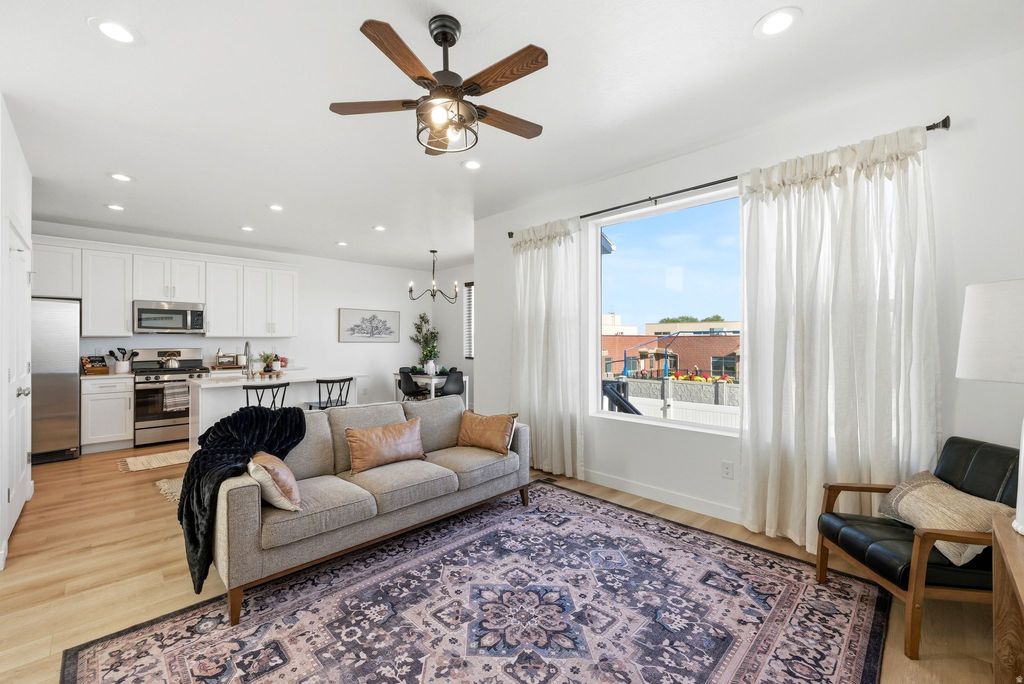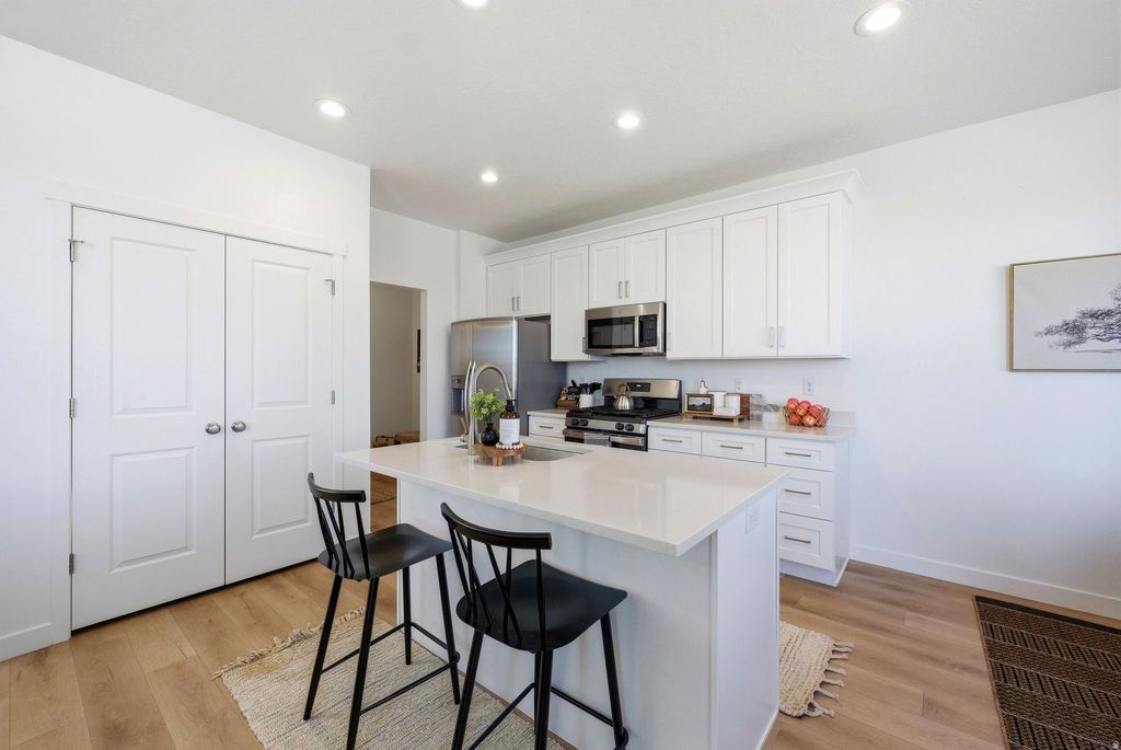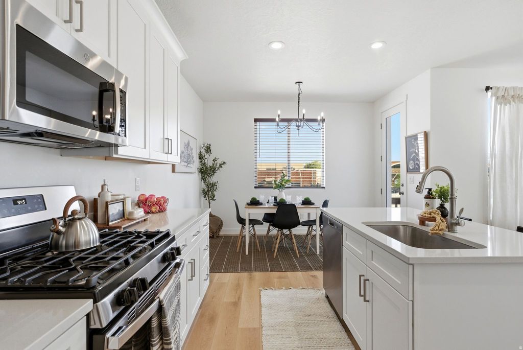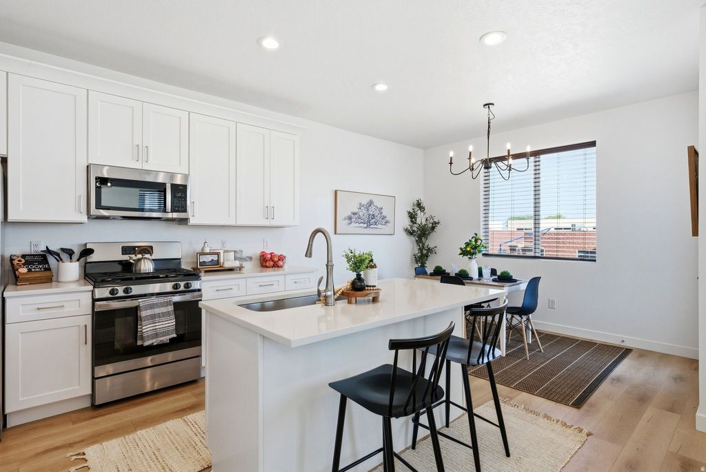 Darling and almost new, end unit townhome for sale! The main level is open and is flooded with tons of natural light. This home was designed for modern living, featuring a sprawling family room with high ceilings, upgraded laminate flooring and updated lighting that flows seamlessly into the beautiful gourmet kitchen. The kitchen is complete with stainless steel appliances, sparkling quartz countertops, sleek white cabinetry, a large pantry, and a natural gas oven/range that the chef in the family will love. A convenient half bathroom is located just off of the mud-room area. You can also park two full sized vehicles in the spacious two-car garage! Upstairs, the primary owner's suite offers a private retreat with tons of natural light, a spacious walk-in closet and a luxurious attached en-suite bathroom with a separate shower and huge soaker tub. You'll also find two additional, well-sized, bedrooms, another full bathroom, and a flex area, for relaxing or play. The laundry space is conveniently located near the bedrooms making laundry time a breeze. This home also has an unfinished basement, offering plenty of room to grow. Customize the space to perfectly suit your needs but there is opportunity for another bedroom, bathroom and family room. The location is unbeatable with quick Access to freeways, retail establishments and restaurants. Just around the corner is the community playground, picnic/BBQ and pickleball court offering a fantastic lifestyle right outside your door. ***Seller's are including the refrigerator, Washer and Dryer! *** Square footage figures are provided as a courtesy estimate only and were obtained from county records. Buyer is advised to obtain an independent measurement and verify all information.***