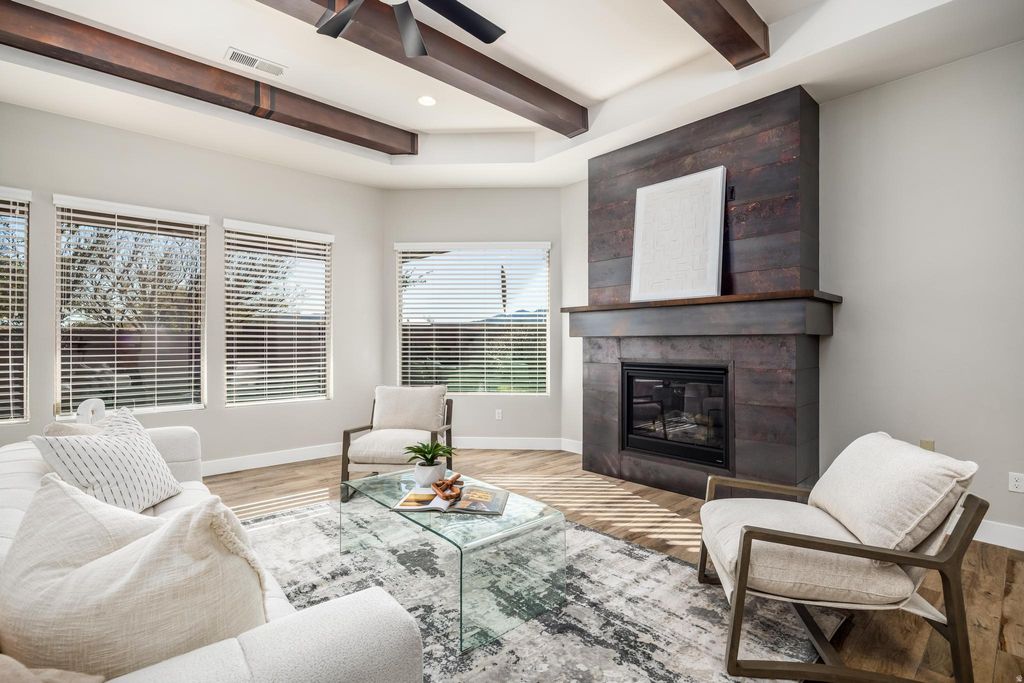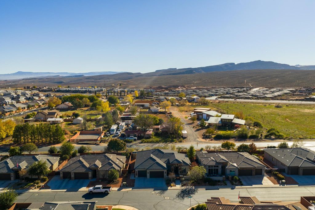 This upscale residence showcases exquisite custom copper accents throughout, creating a warm and sophisticated aesthetic. From the striking sunburst entry gate and outdoor sconces to the fireplace surround, range hood, beams, chandeliers, pendant lighting, and primary suite barn door, every detail reflects thoughtful craftsmanship and timeless design. Expansive picture windows frame unobstructed, breathtaking views of Red Mountain while filling the home with natural light. The open, entertainer-friendly layout is complemented by elegant quartz countertops and seamless indoor-outdoor living. Step into a quiet, private backyard complete with a Lifetime storage shed-perfect for relaxing or hosting gatherings. Ideally located just four miles from Tuacahn Amphitheatre and nestled near the stunning landscapes of Snow Canyon, this home also sits in a welcoming, friendly neighborhood only steps from Unity Park. Enjoy nearby pickleball, tennis and baseball courts, a splash pad, climbing wall, playground, and pavilion. A rare blend of refined luxury, scenic beauty, and exceptional community amenities-this is truly a wonderful place to call home.