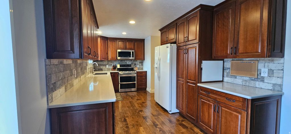This home has been meticulously cared for, with thoughtful and timeless updates throughout. Features include RV parking with electrical hookup, motion-sensor exterior lighting, an oversized storage shed, and water-wise landscaping. Inside, you'll find LED lighting throughout, built-in bookcases with hidden jewelry storage in the primary bedroom, and a spacious primary bathroom featuring a beautiful double vanity. Major updates include a roof replaced approximately five years ago, updated basement flooring within the last five years, and a tastefully remodeled kitchen completed six years ago with white stone countertops, stone back splash, and rich dark LVP flooring. The flooring on level 2 was all replaced this year, making this home truly move-in ready. The walkout lower level adds flexibility and versatility to the home, while the fully fenced backyard provides privacy and space to enjoy. This is a property you will not regret choosing. Showings by appointment only. Please do not hesitate to call with any questions. The owners have loved every part of this home and are excited to pass it on to a new family ready to create lasting memories
