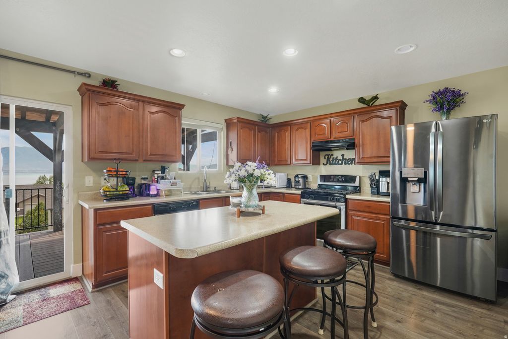 Showcasing breathtaking Utah Lake and mountain views, this beautifully maintained home is located in a desirable neighborhood with flexible living space. The main level features an open and inviting layout with a spacious living room with lots of natural light. The kitchen offers ample cabinetry, generous counter space and large island. The fully finished basement expands the versatility and includes a large family room, kitchenette, 2 bedrooms, bath, laundry and a separate exterior entrance, making it an excellent option for multigenerational living. Thoughtfully designed outdoor spaces include a large deck, terraced backyard with easy maintenance landscaping plus RV parking on the side.