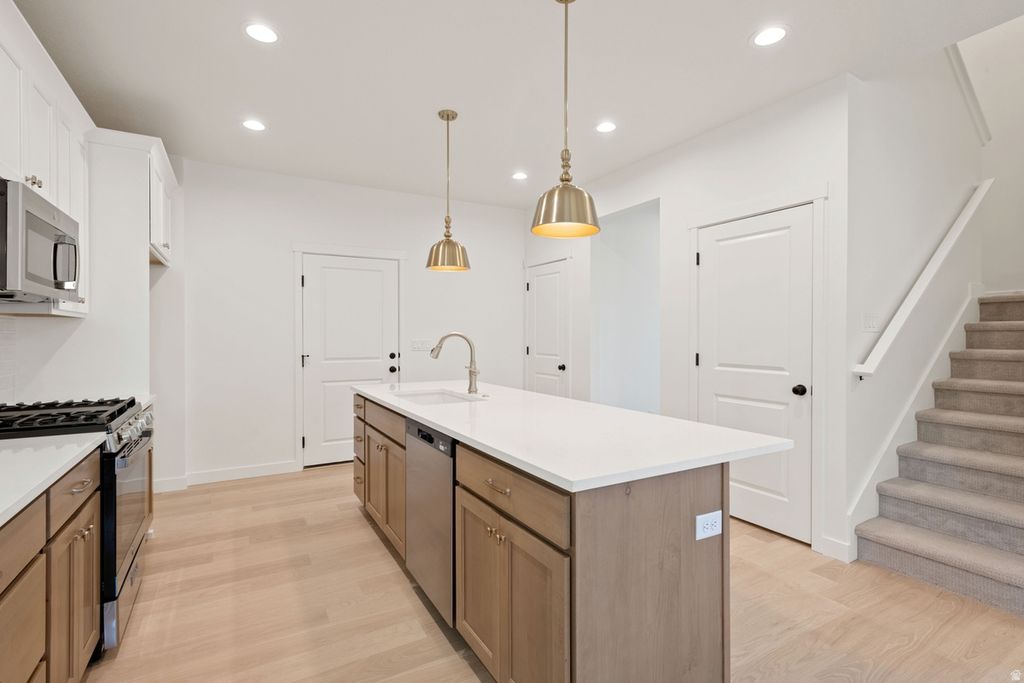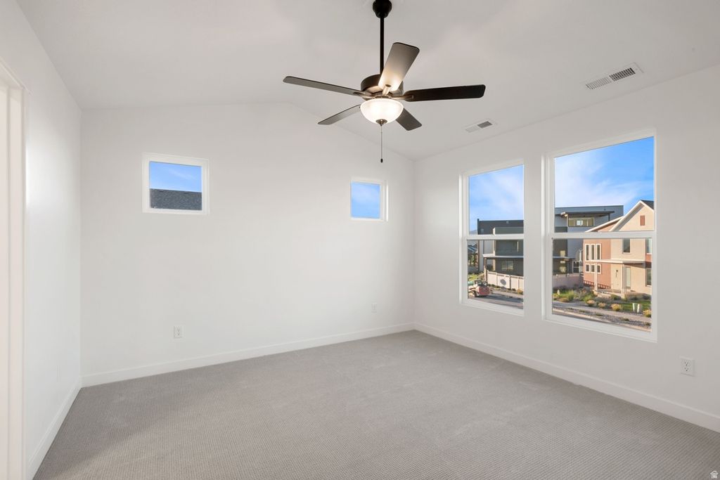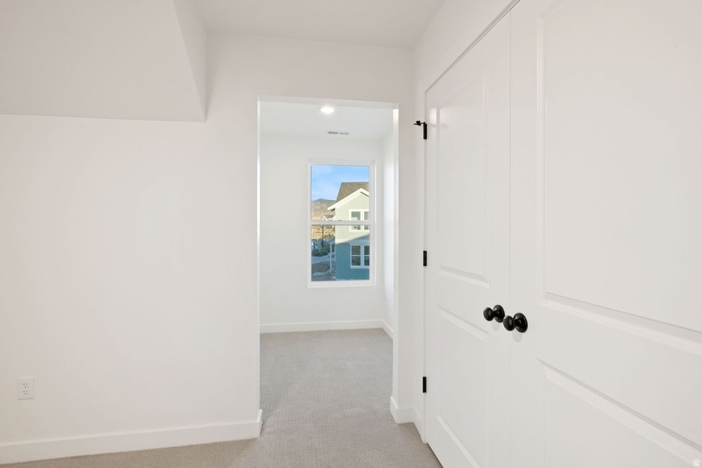 Welcome to the Alden floor plan, a stunning home in beautiful Daybreak, perfectly situated on a HUGE corner lot with an extra long private driveway and a fenced in side yard just down the street from The Watercourse. With the Cove House and other amenities a short walk away, making this a premier location. On the main floor you'll find a convenient half bath, the kitchen features GE stainless steel appliances, soft-close cabinets, a stylish backsplash, and an expansive area for dining. Upstairs, large secondary bedrooms with flex areas provide plenty of space, vaulted ceilings in the primary bedroom enhance the spacious feel, while upgraded flooring and designer lighting elevate every inch of this home. Plus, with a 2-year builder warranty and a 10-year structural warranty, you'll enjoy lasting quality and peace of mind for years to come! Schedule a showing today! Buyer and buyer's agent to verify all information. Photos are from a previously built home of the same floorplan, colors and finishes may vary. **Model Home Sales office located at: 6656 W Key Largo Way