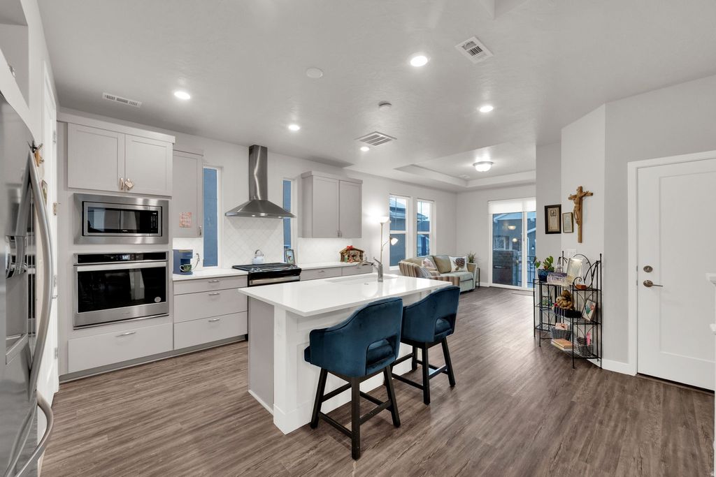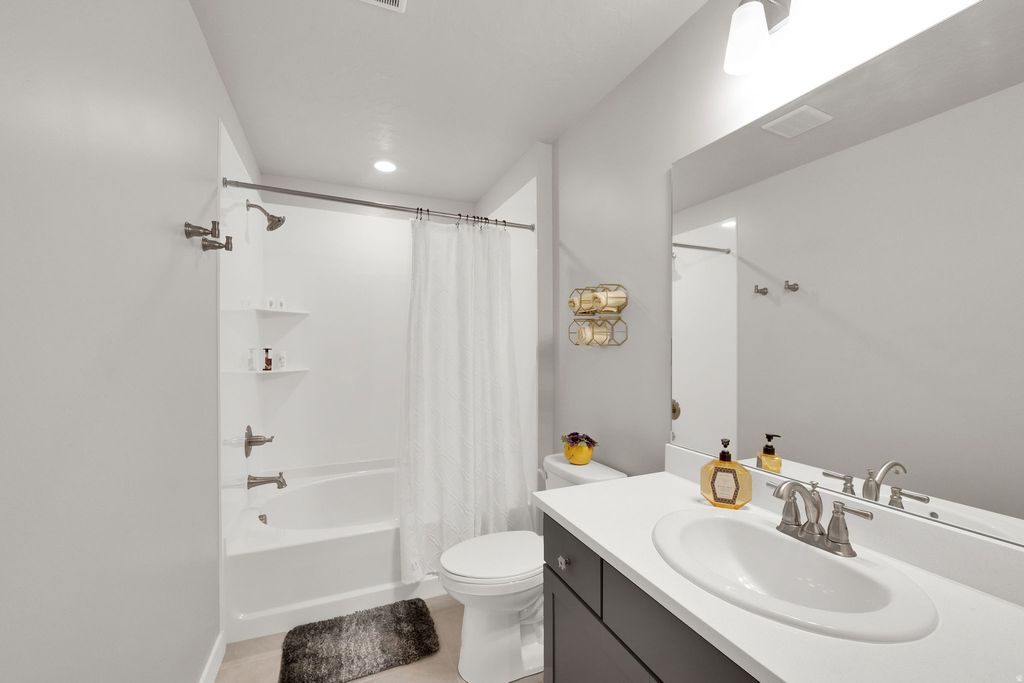 SHORT SALE. located in a premier 55+ community. Enjoy living just across from pickleball courts and the 10,000 sq ft community clubhouse. This inviting three-bedroom, three-bath home offers a well-designed layout with an upstairs suite that includes a private family room, ideal for guests or additional living space. The primary bedroom is located on the main level and features an upgraded en-suite bath with a beautifully patterned tile floor, a spacious walk-in shower, ample cabinetry, and a large walk-in closet. The chef's kitchen is perfect for entertaining, offering abundant countertop space and room for two to three people to prep comfortably. Barstool seating creates a welcoming gathering spot to enjoy watching the chef in action. All cabinetry includes rollout shelves for easy access to cookware. The kitchen is fully equipped with Whirlpool appliances, including a gas range and a separate gas Whirlpool oven positioned below the microwave. The back patio is enhanced with a dedicated gas line directly from the kitchen, making it ideal for a gas grill with no need for propane. The two-car garage provides exceptional storage with a spacious storage room that wraps behind the laundry room and extends beneath the stairs.The fully fenced yard is maintenance-free, with front and backyard care provided by the HOA. Enjoy the Daybreak lifestyle with a golf simulator, pickleball, large community kitchen and gathering spaces, fitness rooms, pools and hot tubs, lake recreation and fishing, walking trails, parks, and convenient access to shopping and entertainment. Square footage figures are provided as a courtesy estimate only and were obtained from county records. Buyer is advised to obtain an independent measurement.