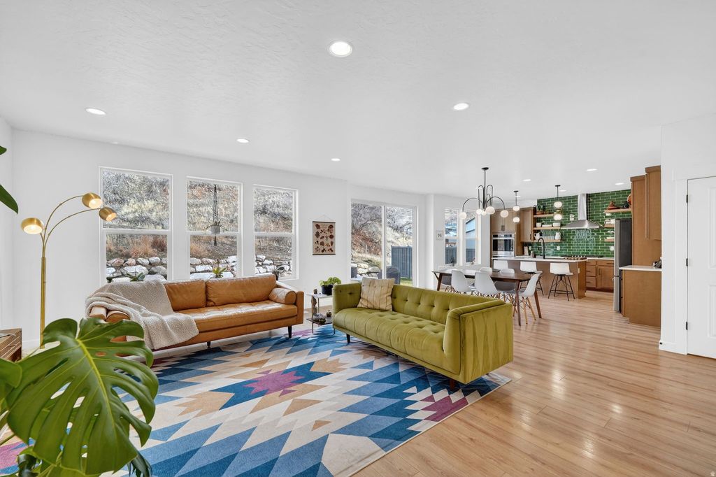 Nestled against the hillside, this striking modern home offers refined living against a stunning mountain backdrop. Inside the open concept main level is filled with natural light and showcases 9 ft ceilings, upgraded flooring, recessed lighting and a thoughtfully designed living space perfect for both everyday living and entertaining. The chef's kitchen is a standout featuring custom cabinetry, large center island, high end appliances with double oven, gas cooktop, quartz countertops and stylish tile backsplash that adds character and charm. The primary suite offers a peaceful retreat with generous space, large windows and ensuite bath. Downstairs the fully finished basement provides a spacious family room with endless possibilities, 2 guest bedrooms and bath. Step outside to a private backyard with peaceful mountainside views. Enjoy community amenities such as clubhouse, pool, tennis and basketball courts, multiple parks and easy access to scenic trails.