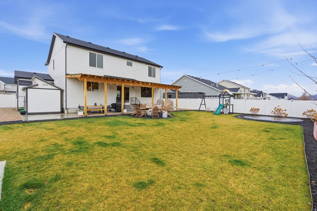 Enjoy the best of both worlds in beautiful Mapleton-peaceful rural living with modern conveniences just minutes away. This stunning 5 bedroom, 3.5 bath designer's home is filled with gorgeous, high-end features, including quartz countertops, double ovens, a gas cooktop, a cozy fireplace, a thoughtfully designed built-in office space as well as a beautiful mudroom that adds both style and everyday functionality. Step outside to an exceptional private outdoor living space featuring a covered patio, playground, in-ground trampoline, and a fully fenced yard, perfect for entertaining, play, and relaxation. The 3 car garage is extra deep providing ample room for a full size truck. This home offers comfort, style, and space in a setting you'll love coming home to.