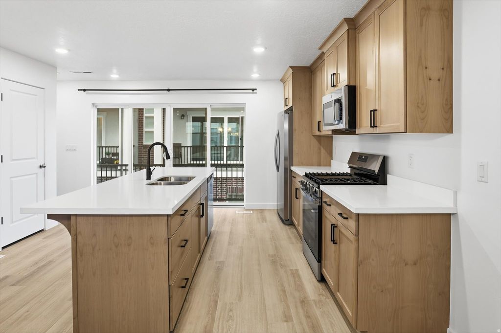 This light-filled home features a spacious, open main floor with 9' ceilings, massive windows, and a 10' sliding glass door leading to a private balcony. The gourmet kitchen is elevated with 42" designer cabinets, Quartz countertops, laminate floors, and a large pantry, while the home comes move-in ready with a tankless water heater and integrated smart home system. Perfectly situated for ultimate convenience, you'll enjoy quick freeway access and are just minutes from Costco, Harmons, and premier shopping.