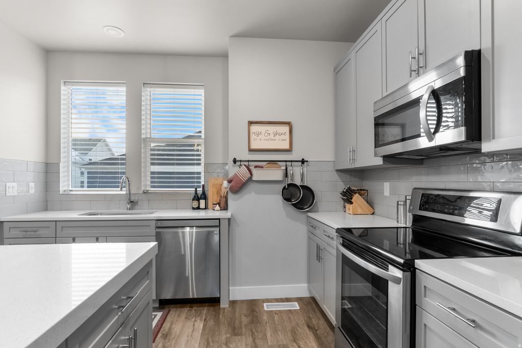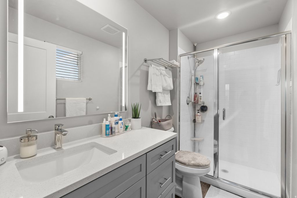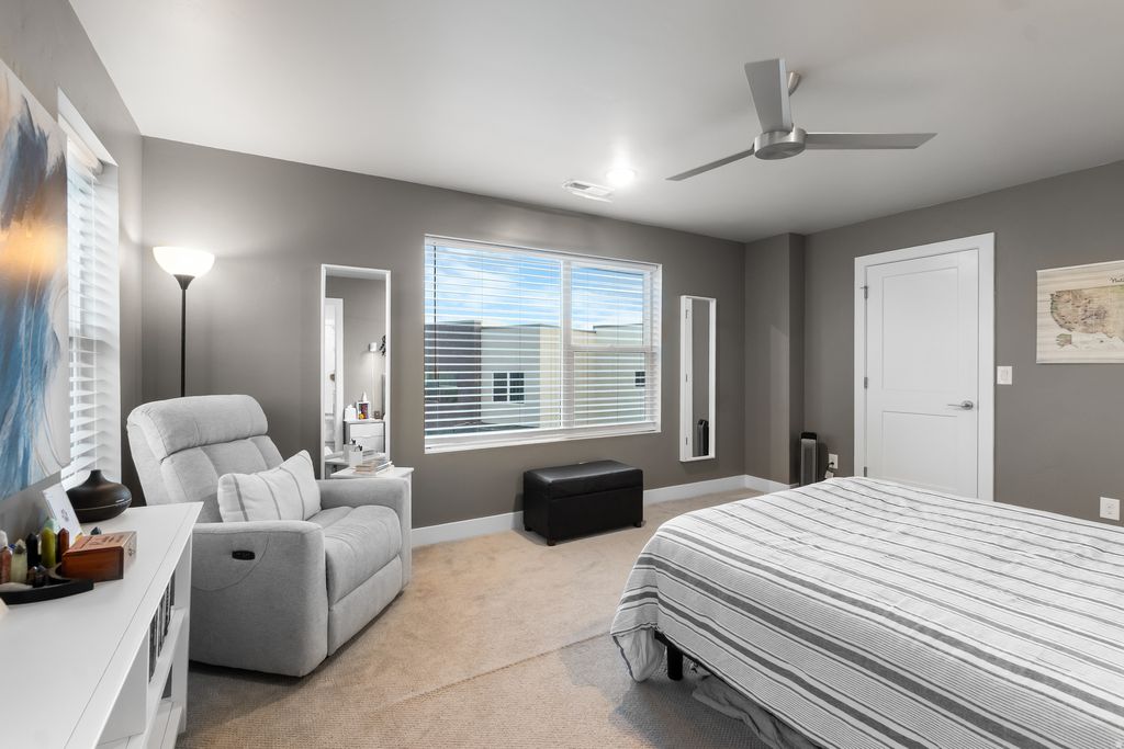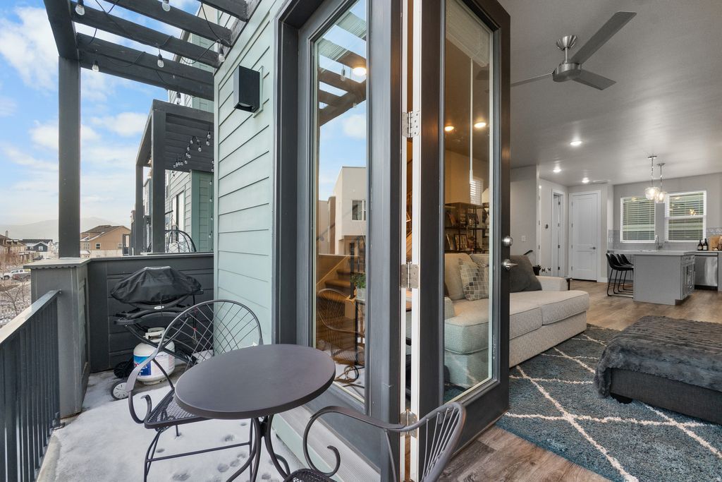 Come see this home in South Jordan's full-of-life Daybreak community. Enjoy the amenities including access to trails, parks, the community center, the beautiful Oquirrh Lake & more. The home itself matches just how premium this location is, with a modern kitchen & island, great family room space, as well as a walkout balcony/pergola to admire the views. The 3rd level features a primary bedroom and bathroom with a walk-in closet and a breathtaking view of Utah's iconic Wasatch Range mountains. Across the hall is an additional bedroom with an attached private bathroom, a walk-in closet, and another great view. There is a tankless water heater, extra depth in the garage for storage or a workshop, and an enclosed front patio with a Ring doorbell and keyless-entry front door. The garage is painted and comes with a smart garage opener and EV charger. Schedule to come see this charming home and one-of-a-kind community today!