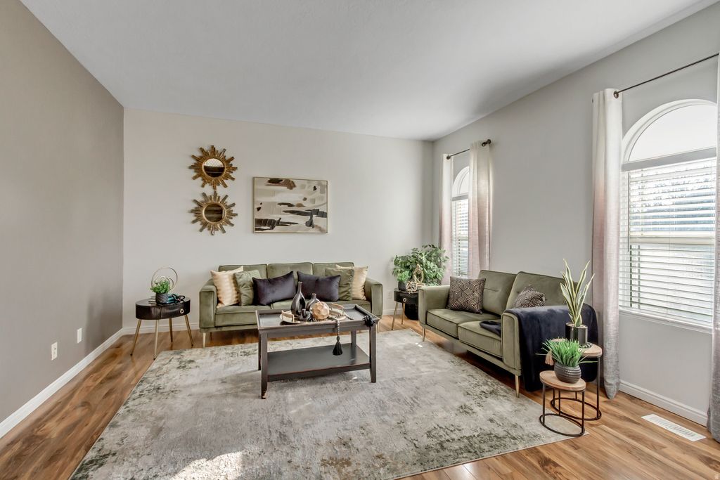 Welcome to this beautiful, spacious, 4-bedroom, 3.5-bath home in a prime West Jordan location! Featuring two generous family rooms, this home provides plenty of space for both relaxing and entertaining! The kitchen shines with updated granite countertops, recessed lighting, modern hardware, and upgraded appliances including a new dishwasher and microwave. All bathrooms have granite countertops and have been tastefully updated. New blinds and lighting fixtures add a fresh, move-in-ready feel throughout the home. The primary suite is a true retreat, complete with elegant double doors, a walk-in closet, and a full bath. The fully finished lower level includes a family room, bedroom, and full bath-perfect for guests. Plus a large storage room and additional storage in the utility room. Step outside to the back patio and enjoy the added bonus of open space directly behind the home, featuring a basketball court, playground, and extra parking. Conveniently located just minutes from shopping, dining, and entertainment at Jordan Landing, with quick access to Bangerter Highway and Mountain View Corridor for an easy commute---Don't miss it!!