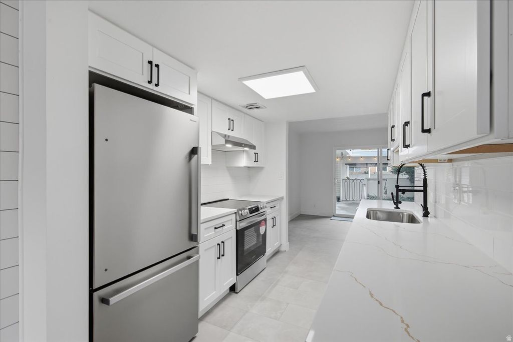 Move-in ready and thoughtfully updated, this desirable Three Fountains end-unit townhome offers comfort, functionality, and abundant natural light. Recent improvements include brand-new windows, fresh interior paint, new flooring throughout, and an opened-up kitchen featuring new appliances. The upper level offers three bedrooms, including a spacious primary suite with a private balcony and multiple windows that fill the space with natural light. The main level features a welcoming living room, a newly updated kitchen, and a dining area with large sliding glass doors leading to a charming private patio. A generously sized bedroom and a bath complete this level. The basement provides a versatile open space with a striking rock fireplace, a laundry room with sink and new cabinetry, and an additional refrigerator and range currently in place-offering potential for a small accessory apartment or flexible living area. From the moment you step inside, it's easy to envision this space as your next home. Information deemed reliable but not guaranteed. Buyer to verify all information, including square footage. Square footage is sourced from county records.