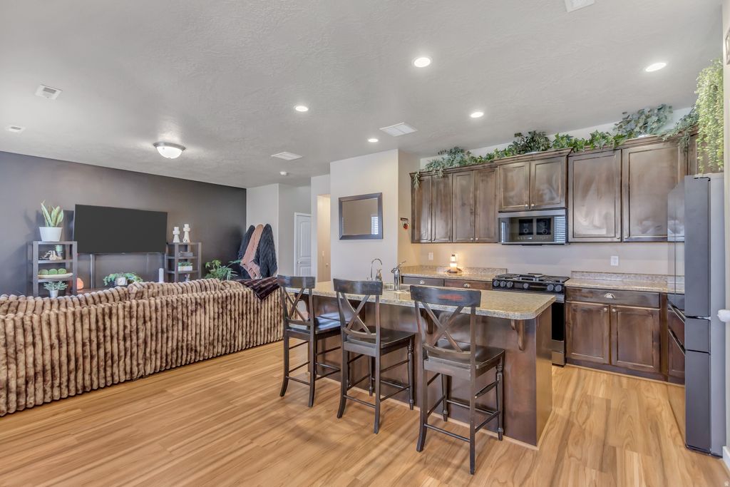 Welcome home to this beautifully remodeled townhome in the highly sought-after Rushmore Park community! Designed to impress, this light-filled home features open, airy living spaces, brand-new flooring, and a stunning great room perfect for both everyday living and entertaining! The chef's kitchen is a true showstopper, boasting all new, top-of-the-line appliances, reverse osmosis water, gas cooking, an extra-large kitchen island, and abundant counter space-ideal for hosting gatherings or casual family meals! A vaulted entry foyer creates an inviting first impression and sets the tone for the home's thoughtful design.Retreat to the luxuriously remodeled master suite, complete with a custom enlarged shower, separate oversized soaking tub, and elegant finishes! Enjoy breathtaking Wasatch Front mountain views and relax outdoors in the fully fenced backyard, featuring a covered patio perfect for barbecues and outdoor entertaining!Ideally located close to highways, schools, shopping, and dining, and just blocks from the new Salt Lake Bees Stadium and Mountain View Village, this home combines modern comfort with unbeatable convenience. This is Rushmore Park living at its finest-stylish, spacious, and move-in ready! Buyer to verify all listing details.