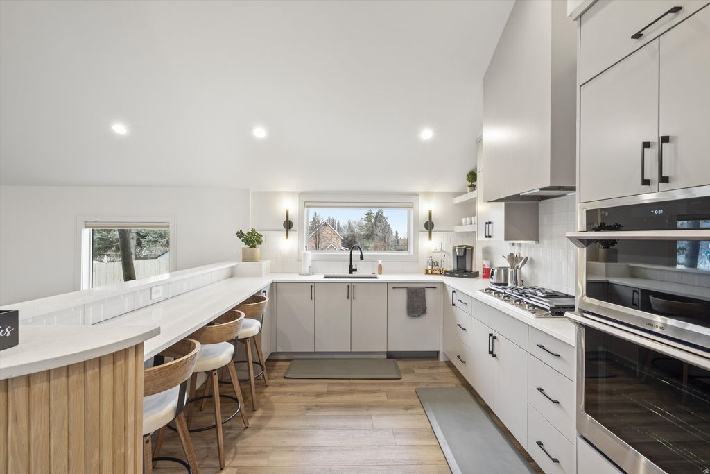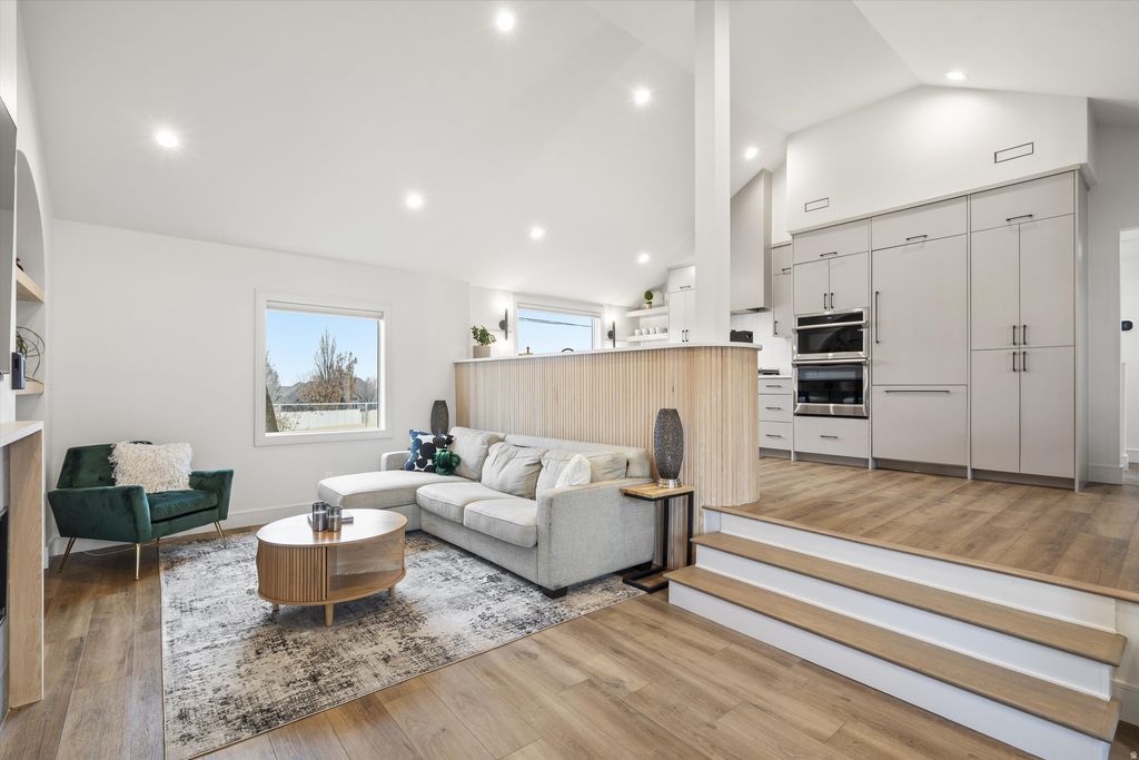 This home welcomes you with a grand covered front patio featuring Mount Olympus views, a custom outdoor fireplace, honed granite pavers, and a cedar tongue-and-groove ceiling-an inviting space for year-round enjoyment and a private retreat to relax and recharge. Inside, vaulted ceilings and abundant natural light highlight the open living and kitchen areas. The living room is anchored by a striking 60" gas fireplace with custom quartz floating benches. The chef's kitchen is thoughtfully designed with custom soft-close cabinetry, a Bosch panel-ready refrigerator, panel-ready dishwasher, and a Samsung gas cooktop with smart combination microwave wall oven. Designed for modern living, the home is fully integrated as a smart home, offering enhanced efficiency and convenience with smart window treatments, lighting, heating, and locks. Throughout, you'll find thoughtful design details including unique tile work, custom millwork, granite and quartz countertops, and a tankless water heater. Ideally located near top-rated schools, premier dining, and convenient freeway access, this home offers elevated living in one of Millcreek's most desirable locations. Square footage figures are provided as a courtesy estimate only and were obtained from the previous MLS listing. Buyer is advised to obtain an independent measurement.