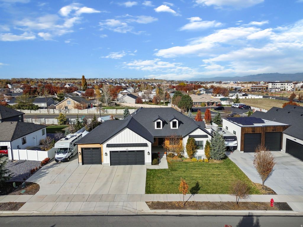 Modern Sophistication Meets Timeless Craftsmanship. Finding the perfect home can feel elusive-until you discover 4056 W. Sullivan Rd, a custom- built masterpiece that effortlessly balances tranquility & convenience. Every element of this home has been personally curated to reflect modern-contemporary elegance, elevated by fine finishes and bespoke craftsmanship. From the moment you step inside, soaring ceilings and walls of natural light create an atmosphere of understated luxury. The open-concept floor plan flows seamlessly, offering spaces that are both inviting and impeccably designed. The gourmet kitchen is a true showpiece-featuring a striking quartz waterfall island, solid wood cabinetry, composite sink, and Professional-grade Viking appliances, including a gas stove. Expansive windows fill the space with light, while direct access to the spacious covered patio - with ceiling covered teakwood, makes entertaining effortless. Anchored by a stunning gas fireplace, the great room exudes warmth and character, with custom teakwood shelving, vaulted ceilings, and soft recessed lighting-perfect for intimate evenings or lively gatherings. The primary suite is a serene retreat. The spa-inspired ensuite bath features a walk-in shower, dual vanities, and a generous walk-in closet. One additional main-level bedroom (or an optional 3rd bedroom to replace the office) offers versatility for guests or remote work. A wide, graceful staircase leads to the finished lower level, where a large family room, 3 additional bedrooms, and a beautifully appointed full bath create the perfect space for relaxation and entertainment. Thoughtful details abound-ample storage, a large utility room, and a reinforced "L" shaped safe room (10x7 for the main and the back is 10x5) with a built-in gun-safe door. Smart-home integration, reverse osmosis system, water softener with the holding tank in the garage for easy access, and generator-ready wiring ensure modern convenience. Outdoors, the .32-acre property is a private oasis. The landscaped yard, with 20 mature trees, drip irrigation, and a cozy natural gas-fed fire pit, offers beauty and function in equal measure. The hot tub and shed are included, and the fenced backyard will be sure to spoil your furry friends with ample space to explore. Car enthusiasts will appreciate the oversized 1,209 sq. ft. 3-car (tandem 4-car) garage, complete a 30-amp interior plug, and hot/cold water access. The extended RV pad runs to the back of the property, offering abundant parking for recreational vehicles and toys and an exterior 50-amp RV plug for convenience. This residence represents more than a home-it's a lifestyle investment in craftsmanship, comfort, and enduring style. Note: basement is plumbed for a 2nd kitchen. Square footage figures are provided as a courtesy estimate only and were obtained from county records. Buyers are advised to obtain an independent measurement.