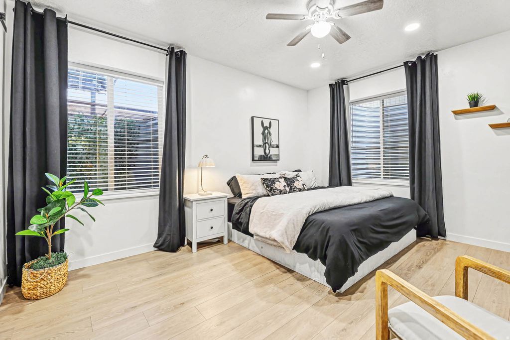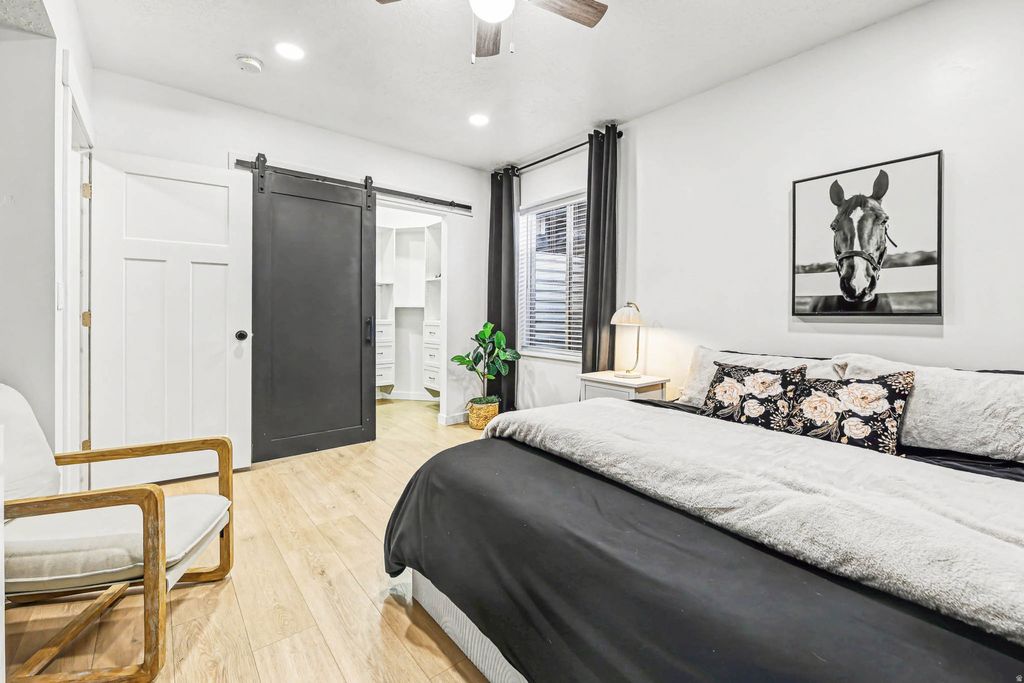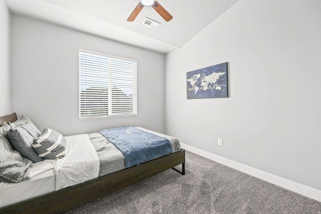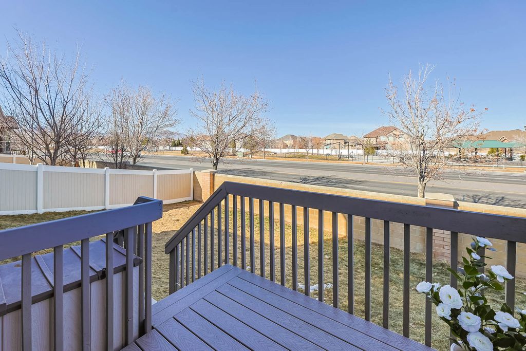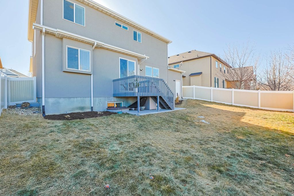 Welcome home to this 5-bedroom beauty in the heart of South Jordan, where space, upgrades, and convenience come together. Enjoy upgrades such as: double vanity sinks, Google Fiber internet, and permanent trim lighting that delivers year-round curb appeal and an EV charger. The newly finished basement is a true standout, featuring a large open theatre room (with included sectional and sound system) and a dedicated salon space-perfect for entertaining, working from home, or hosting epic movie nights. You'll also appreciate the ample basement storage, paired with a garage offering extra deep space plus, above built-in storage and its own EV charger. This north-facing home is a Utah native's dream-meaning the owners haven't picked up a snow shovel in months. Step outside and enjoy a short walk to the neighborhood park, playground, and splash pad, making this home as fun as it is functional. Plus, you're less than 5 minutes from Costco, Walmart, and everyday shopping.
