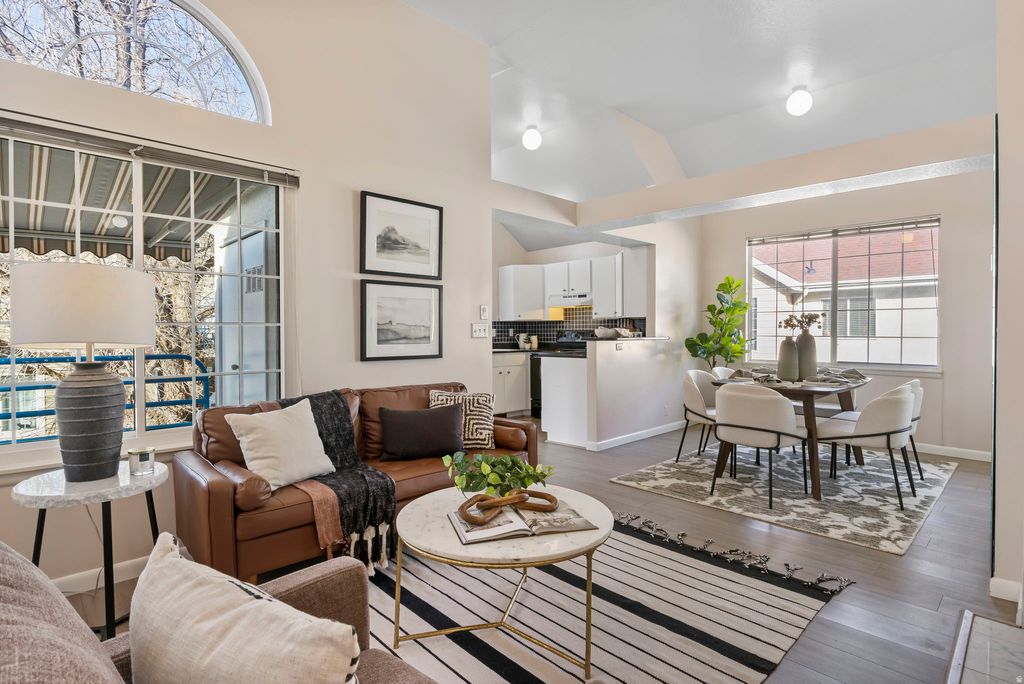 Cute & clean 2 bed, 1 bath condo with 1-car attached garage in a prime Taylorsville location! Convenient mini mudroom upon entering from attached garage or front door then ascend steps to your home's functional layout- great room with vaulted ceilings, lots of natural light. Kitchen, dining, living area with fireplace. Off the kitchen you have an outdoor patio for morning coffee, a perfect spot for potted herbs, or just winding down. Primary bedroom has built-in bookcase, accent ledge, desk space, plenty of natural light from the large window, walk-in closet. Bathroom has double sinks offering space and functionality for an easy daily routine. In-unit washer and dryer included for your convenience. Community features a clubhouse, two pools, spa, tennis court, basketball court, exercise room- giving you resort-style amenities just steps from your door. Included in your HOA dues is water, sewer, trash, snow/ lawn maintenance & cable TV. This unit has no neighbors above or below you. Ideal location, situated near both I-15 and I-215. Walking access to shopping, grocery stores, cinema, restaurants. Close to Riverwalk and other Taylorsville area parks and open spaces. Square footage figures are provided as a courtesy estimate only and were obtained from county records. Buyer is advised to obtain an independent measurement. EXCLUDED are the primary bedroom curtains.