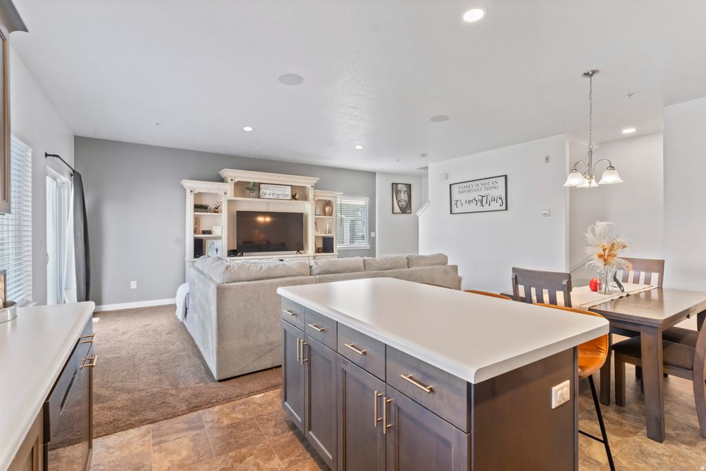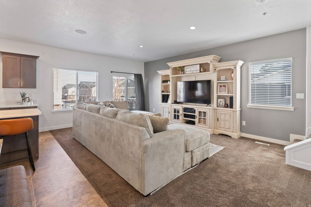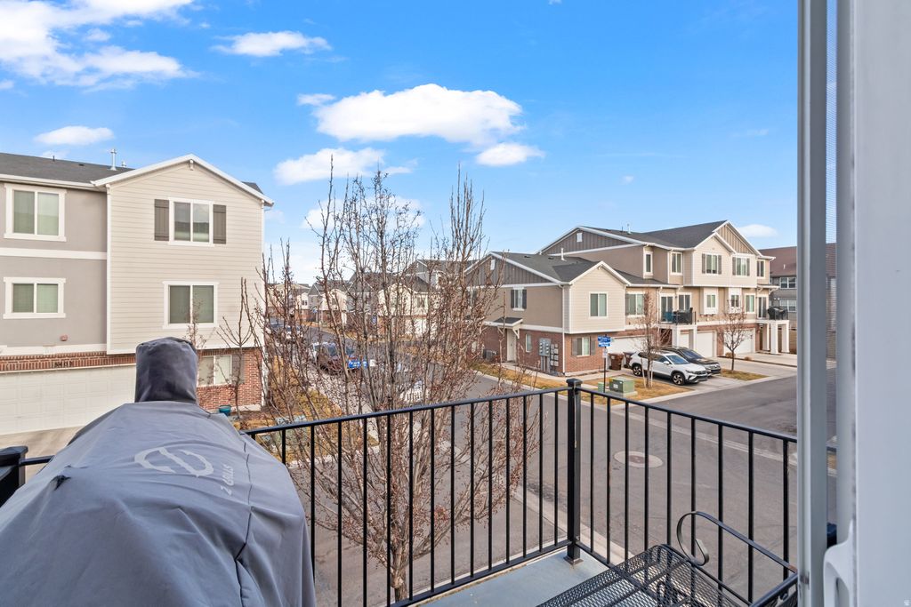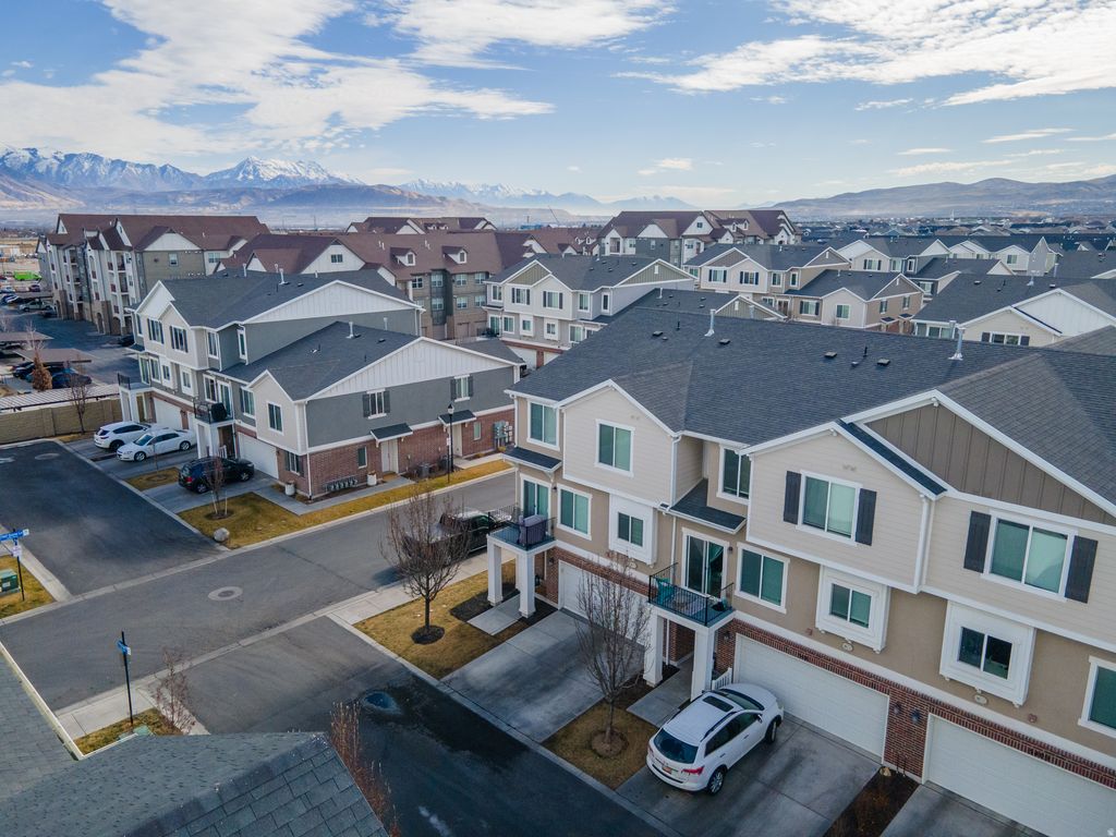 End-unit 3-bedroom townhome located in a newer Herriman community featuring 9' ceilings and lots of natural light. The spacious kitchen and family room are upstairs and open to a balcony off the family room, perfect for grilling and relaxing. As an end unit, this townhome offers additional privacy, extra natural light, and an enhanced sense of space throughout. The two-car garage includes extra storage space. Great location near the Mountain View Corridor with close access to shopping, dining, parks, playgrounds, and elementary, middle and high schools, all within walking distance. The home has been meticulously cared for and is truly move-in ready. Buyer is advised to obtain an independent measurement.