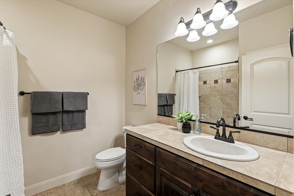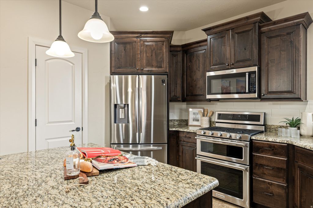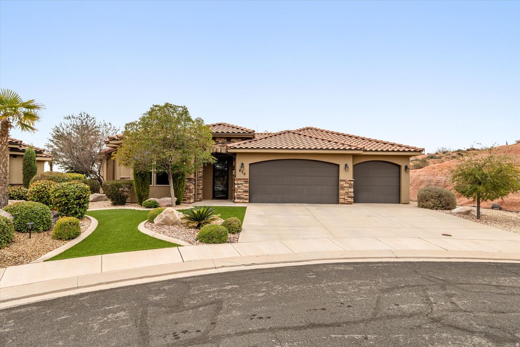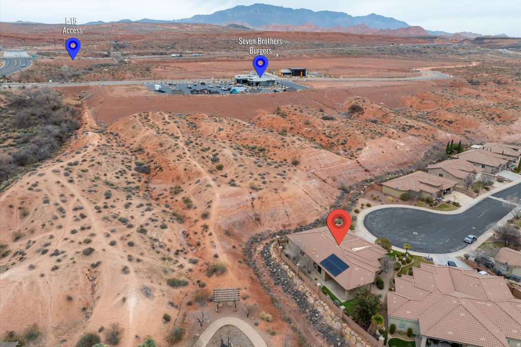 Tucked at the end of a quiet cul-de-sac and backing to a natural desert wash with open hillside to one side, this home offers real privacy with no rear neighbors. It feels removed, yet you're just 2-3 minutes to I-15, the Grapevine Trail System, golf, Maverik, and major retail (Costco, Home Depot, Walmart, In-N-Out). The 3-car garage easily fits a couple of vehicles, your side-by-side, bikes, and golf clubs. Rich cabinetry, stainless appliances, wood shutters, and a bedroom that doubles as an office/library with beautiful custom built-ins. Fully paid 10-panel, 3.7 kW solar keeps utility costs low. Covered patio completes the picture.