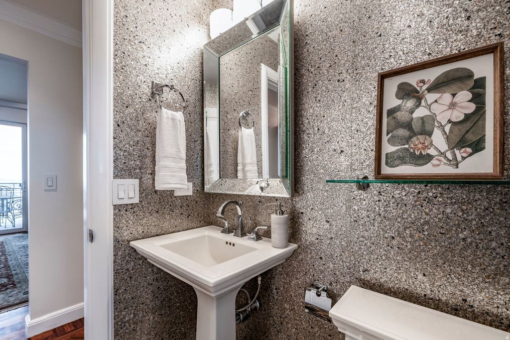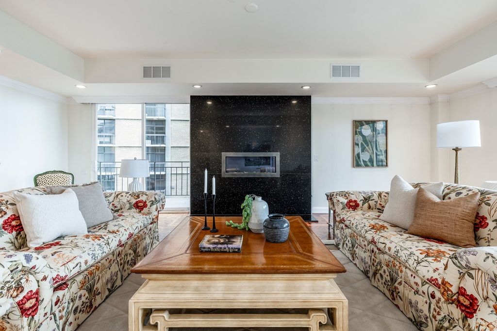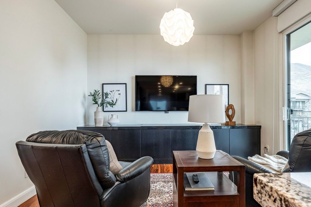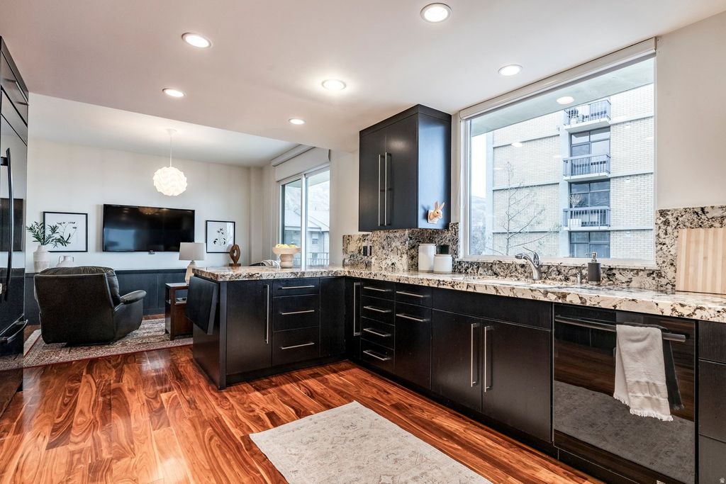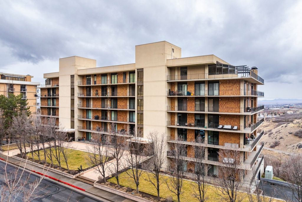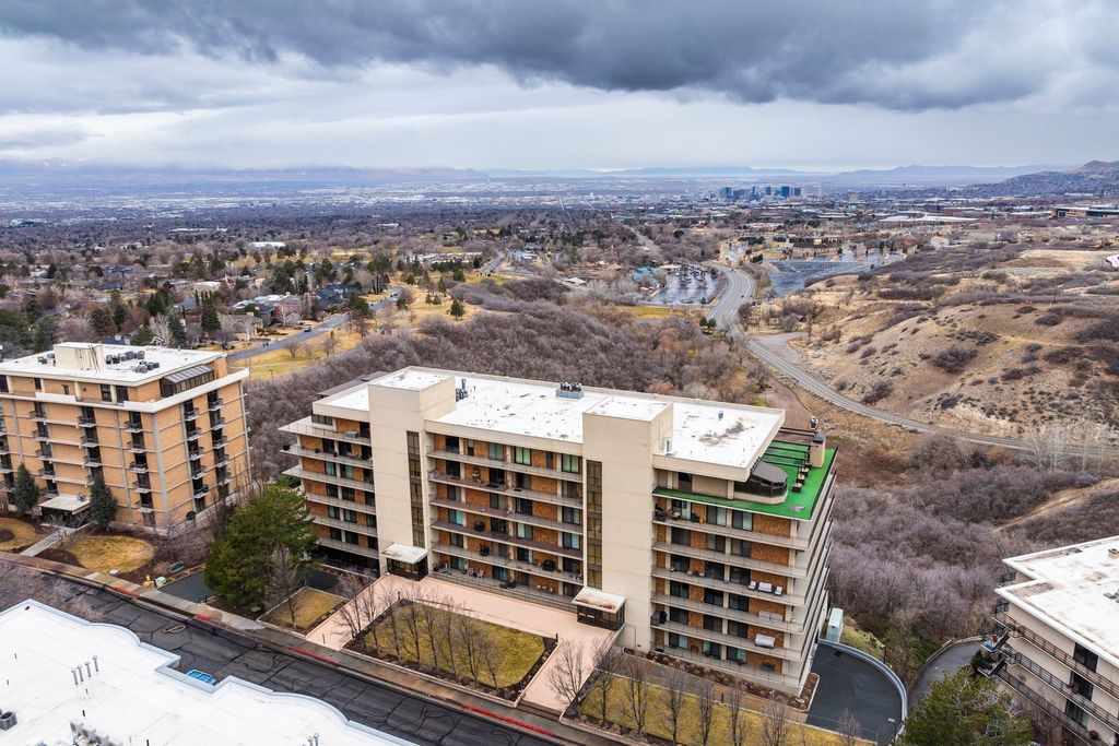Located within the coveted Donner Place Condominiums, this exceptional single level home offers refined luxury paired with effortless living and sweeping panoramic views. Elevated on the fourth floor, this residence captures remarkable southwest facing vistas of the Salt Lake Valley from a 270-degree wraparound terrace. Expansive sliding glass doors on the south, west and east sides invite an abundance of natural light and frame the surrounding landscape. Professionally renovated with a designer's eye and meticulous attention to detail, the home boasts parquet hardwood floors and soaring nine foot ceilings that create an immediate sense of warmth and sophistication upon entry. Thoughtfully integrated LED lighting and a custom gas fireplace with a granite mantel that extends to the ceiling anchor the main living area in modern elegance. The primary suite is a serene retreat, oriented to the west to take in sunset views. A spacious walk-in closet with custom built-ins and motorized window coverings offers comfort and privacy. A well appointed secondary ensuite bedroom offers a generous walk-in closet, dual vanity and Euro glass shower and separate tub, ideal for visiting guests or family. The gourmet kitchen is both beautiful and functional, appointed with abundant custom cabinetry, striking countertops, full height backsplash, bar seating and sleek high-end appliances including a convection cooktop with vented hood. Nearby, a casual sitting area provides the perfect setting for morning coffee as the sun rises over the Wasatch Mountains. A dedicated laundry and office space with custom cabinetry adds convenience and flexibility. The formal dining room is designed for memorable gatherings, while an additional family room, also with built-in cabinets and bookcases, offers an inviting space for reading or relaxing. With only two residences per floor, Donner Place offers a rare sense of privacy. A cedar-lined storage room sits just outside the front door along with an additional storage locker. Ideally located at the mouth of Emigration Canyon, this property provides easy access to shopping, dining, biking and hiking trails, plus close proximity to the University of Utah and downtown Salt Lake City. Two reserved parking spaces in the secure garage and convenient elevator access complete this offering. For those seeking an east bench luxury residence defined by privacy, design and unforgettable views, this is a rare and compelling opportunity.