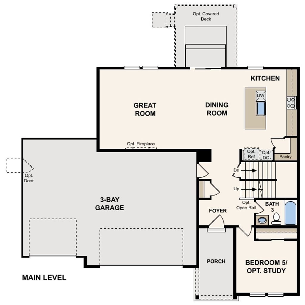 The Raybun plan in the Estates at Sunset Flats blends thoughtful design with flexible living spaces, perfect for both everyday comfort and entertaining. The main level features an open kitchen with a central island and walk-in pantry, flowing seamlessly into the dining area and spacious great room. Optional features like a cozy fireplace or covered deck extend the living experience outdoors, while a three-bay garage with an oversized third bay comes standard, offering extra room for storage, hobbies, or adventure gear. A main-floor bedroom or optional private study adds versatility for guests, remote work, or multigenerational living. Upstairs, the expansive owner's suite serves as a relaxing retreat, complete with a walk-in closet and a well-appointed private bath featuring dual vanities, a walk-in shower, and a soaking tub. Additional bedrooms provide ample space for family or guests, with options to add a sixth bedroom for even more flexibility. An unfinished lower level offers room to grow and personalize over time.