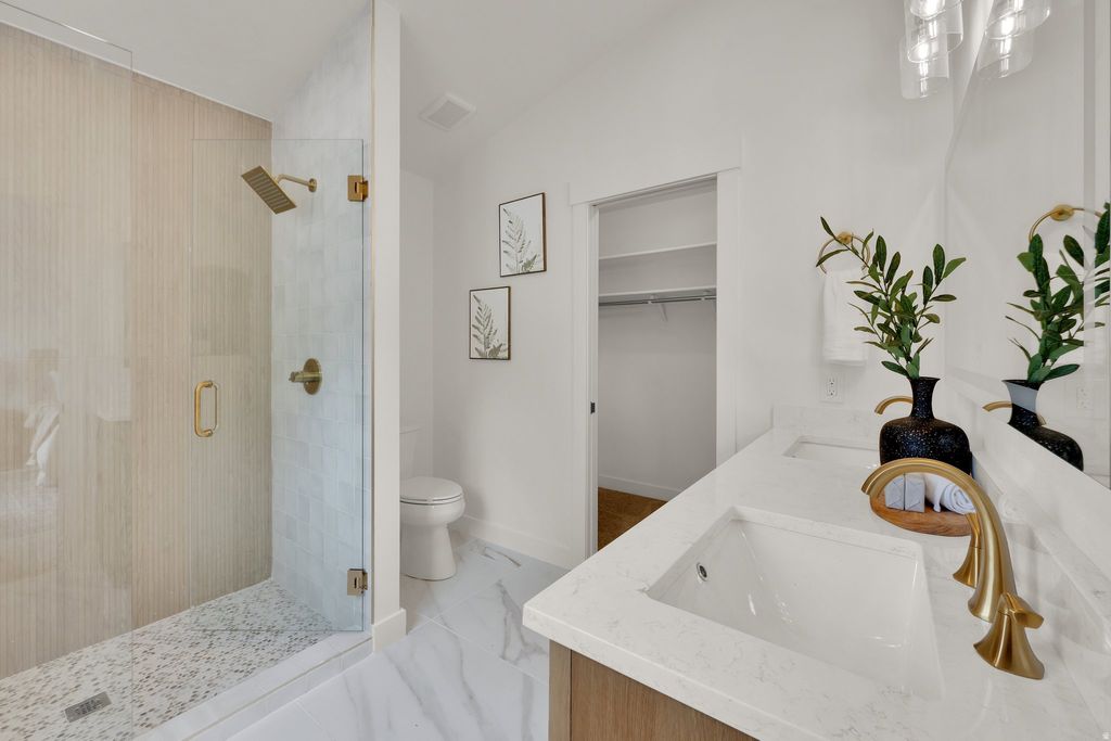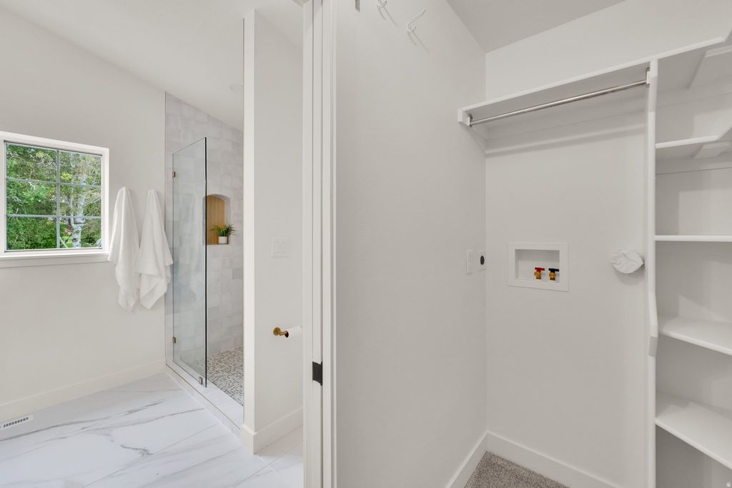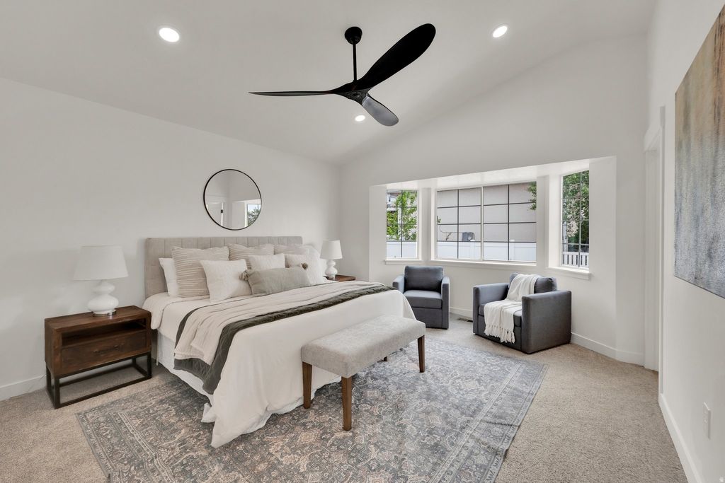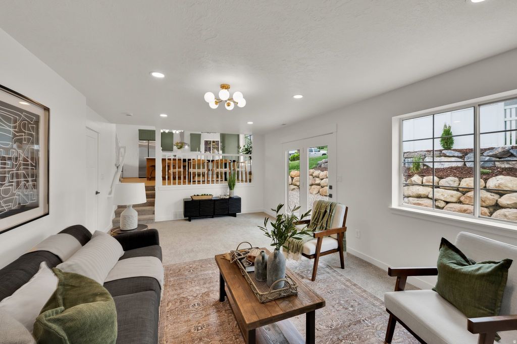 Everything is NEW in this fully remodeled East Bench masterpiece-offering elevated design, panoramic mountain and valley views of the lake with direct access to the Murdock Trail. Vaulted ceilings and an open-concept design create an airy, welcoming feel throughout the main living space. The new designer kitchen features two-toned cabinetry, quartz counters, stainless steel appliances, and an oversized island perfect for gathering and entertaining. Upstairs offers three spacious bedrooms and two luxury baths, including a generous primary suite with a spa-inspired shower and convenient laundry hookup in the walk-in closet. The lower level provides exceptional flexibility, the light-filled family room showcases a beautiful fireplace and opens to a private patio perfect for relaxing and taking in the views. Separate entrance into the kitchenette, bath leads to the basement two bedrooms (or one bedroom plus an additional family room) with laundry -ideal for guests, multi-generational living, or a private workspace. It is a legal ADU permit with PG City but may feel like an unconventional layout being a split level. Outside, enjoy a large lawn on a corner lot, garden space, and plenty of room to gather and entertain, plus a storage shed for added convenience. Extended parking accommodates extra vehicles. With quick access to I-15, shopping, and biking and hiking trails in every direction, this East Bench gem offers the perfect blend of comfort, versatility, and outdoor lifestyle.