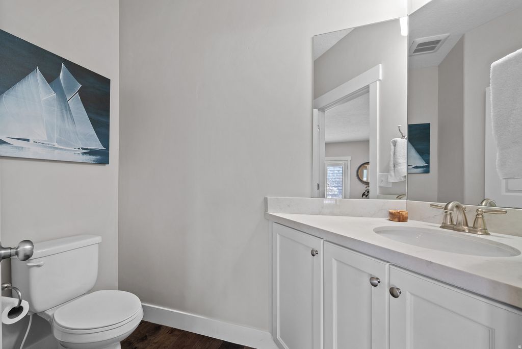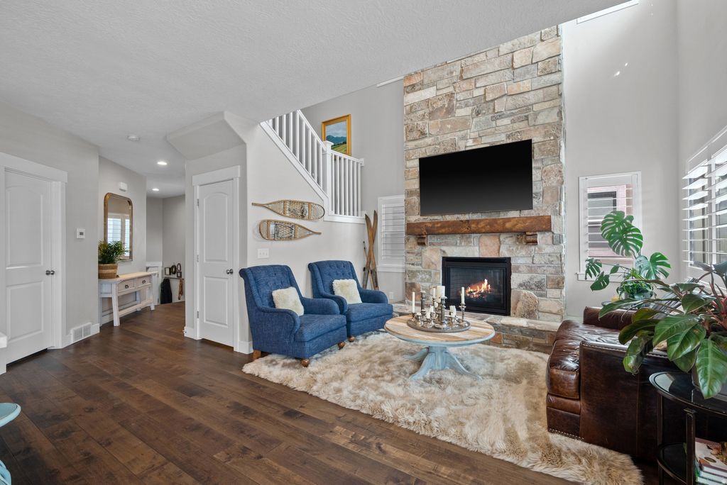 Step into one of the most beautifully upgraded townhomes you'll find, perfectly positioned to capture unobstructed views of the Wasatch Front. Every space has been thoughtfully finished, starting with a striking floor-to-ceiling natural stone fireplace that anchors the living area and creates an immediate sense of warmth and character. The kitchen stands out with its stone backsplash, upgraded appliances, and quality finishes that balance everyday function with timeless style. Quartz countertops, luxury shower surrounds, and custom woodwork in the closets carry the elevated feel throughout the home, along with refined fixtures, wood flooring, cabinetry, and trim. Designed for both comfortable living and easy entertaining, the home also features a built-in wine cellar, a media room with surround sound, and a move-in-ready level of craftsmanship that's hard to find in townhome living. This is a home you truly have to experience in person.