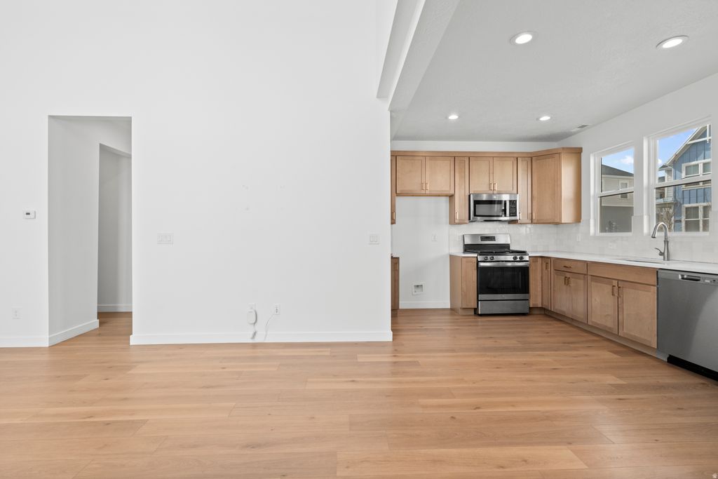 Modern end-unit townhouse in Daybreak. 3 bedrooms and 2 bathrooms, built in 2022. It features a two-car attached garage, central air conditioning, and high-efficiency gas heating. The community includes amenities like a community pool, gym, hiking and biking trails, playground, and more. The interior includes vaulted ceilings, a walk-in closet, a built-in dishwasher, and a gas range, with laminate, tile, and carpet flooring. Square footage figures are provided as a courtesy estimate only and were obtained from county records. Buyer is advised to obtain an independent measurement. Square footage figures are provided as a courtesy estimate only and were obtained from county records. Buyer is advised to obtain an independent measurement.