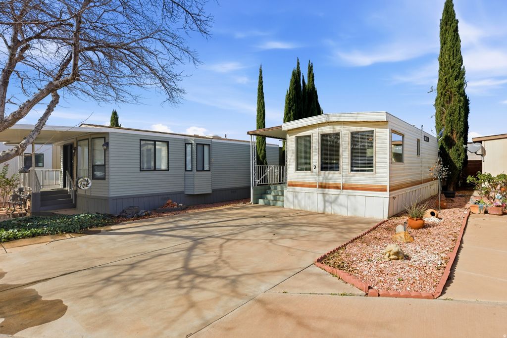 This home sits on an owned lot (no land lease!) making it a rare find at this price for either full-time living or the perfect Southern Utah getaway. One of the bedrooms features its own exterior entrance, creating flexible options for guests, a home office, or extra privacy. Furniture is included, so you can move right in and start enjoying it from day one. Ask about private financing that may be available. Enjoy the pool, clubhouse, or one of many community events. There is covered storage in the back for all your extras., and there's space to park two vehicles. The location couldn't be more convenient--just minutes to the freeway, Costco, shopping and dining in St. George, and an easy drive to the breathtaking trails and scenery of Zion National Park. Whether you're looking for a low-maintenance primary residence or a lock-and-leave second home, this property checks all the right boxes. This is a 55+ community.