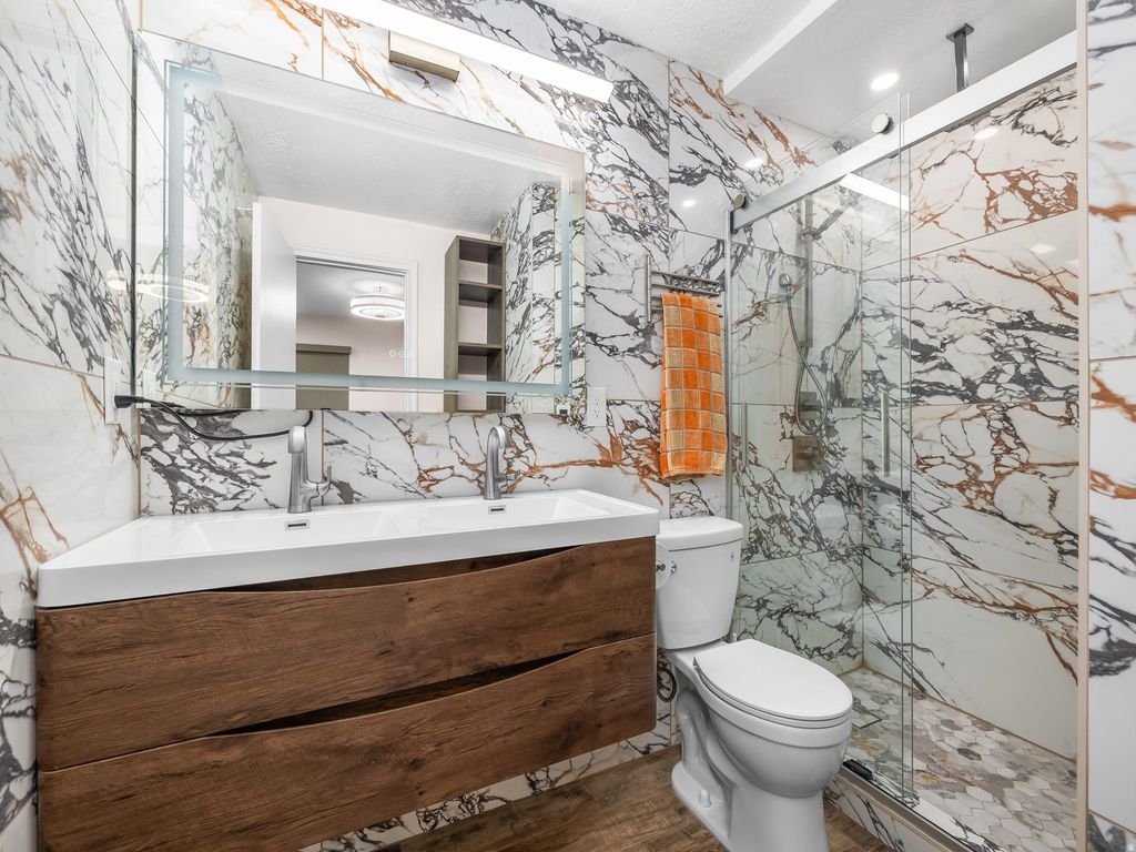 Fully remodeled 4-bedroom, 2-bath rambler in Millcreek with high-end finishes, a large lot, and exceptional outdoor space. This home is truly turnkey with major updates completed by professionals, including a new roof, new electrical (prepared for solar panels and electric vehicle charging if desired), new plumbing, windows, water heater, and central air humidifier. Inside, enjoy a bright, open layout with beautiful hardwood flooring, modern lighting and smart switches, and a designer kitchen featuring sleek European-style cabinetry, quartz countertops, a marble backsplash, stainless steel appliances, and a built-in dishwasher. Two beautifully updated bathrooms offer custom tile, heated floors, new vanities, and contemporary fixtures. Gas fireplace with a remote control thermostat. Step outside to a spacious yard with a garden area and multiple storage sheds. Convenient location near parks, schools, shopping, and quick access to downtown and the canyons. Move-in ready - clean, modern, and turnkey. All appliances and smart blinds are included. Square footage figures are provided as a courtesy estimate only and were obtained from the county records. Buyer is advised to obtain an independent measurement. Agent owner.