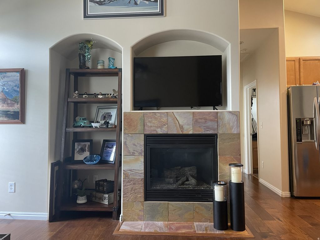 Beautiful move-in-ready 2 bedroom, 2 bath end-unit townhome in West Jordan featuring an open floor plan with vaulted 18 ft ceilings. Highlights include granite countertops, gas fireplace, hardwood HDF flooring, tile bathroom floors, ceiling fans in both bedrooms, deck for barbecuing and a kitchen with reverse osmosis water system. Primary suite offers a full bath and walk in closet. Water heater replaced in 2025; furnace in 2019. Community amenities include a pool and fitness center. Gas stove, refrigerator, dishwasher, microwave, washer and dryer included. Buyer to verify all information.