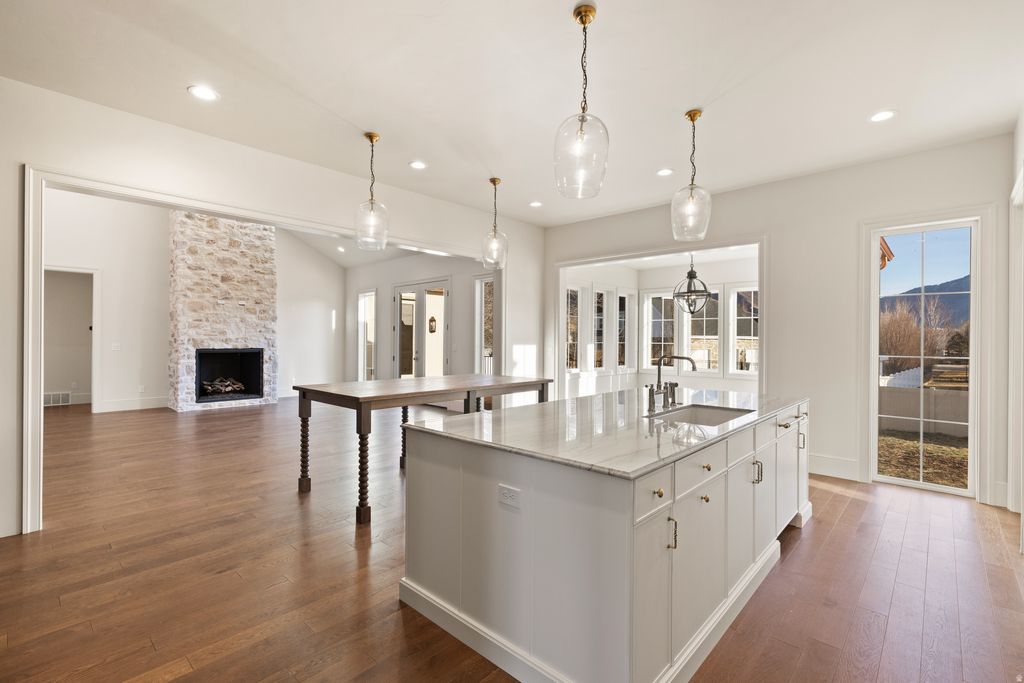 This estate is elegantly simple and simply elegant. The craftsmanship is unlike any other house on the market in Mapleton. As you look closely at the details on this main-floor living home, you'll be impressed with the high-quality finishes, including the ogee edge on the quartz island, the custom floor to ceiling kitchen cabinetry, genuine polished brass plumbing fixtures and designer tile. The engineered hardwood floors look incrediblewhen the sunlight shines through the architecturally designed windows. The walk-out basement is functionally laid out with 4 bedrooms and space for "fun rooms" like a home theater, gym, sauna, golf simulator, etc. Sitting on over half an acre, this home offers you a blank canvas backyard where you can design the perfect spot for your pool, fire pit, garden, pickleball court, etc. Enjoy stunning mountain views in the backdrop on this quite cul-de-sac street. Come see this custom home in person! Call/text the listing agent Mike Gooch anytime for a tour!