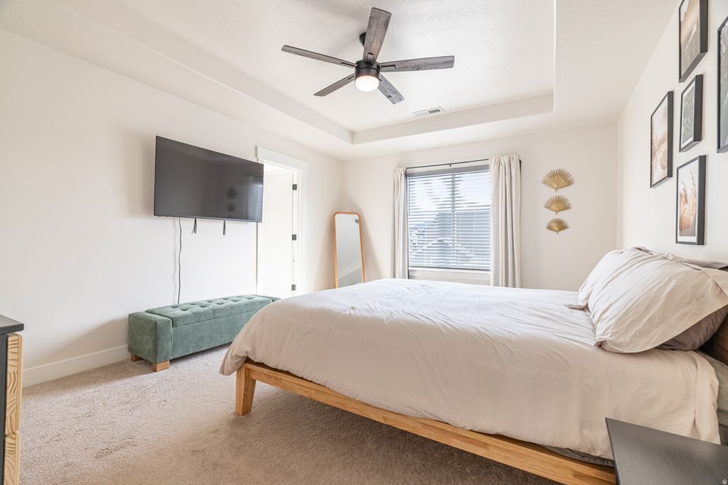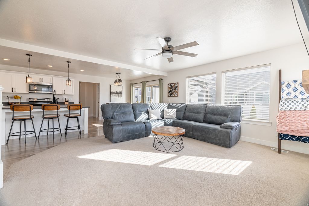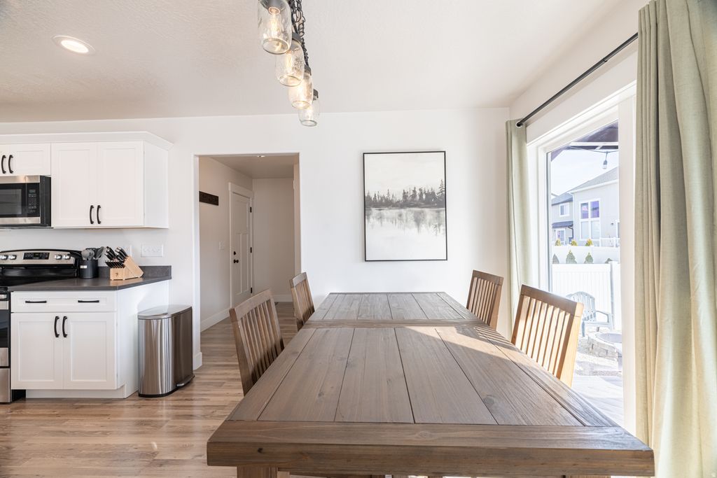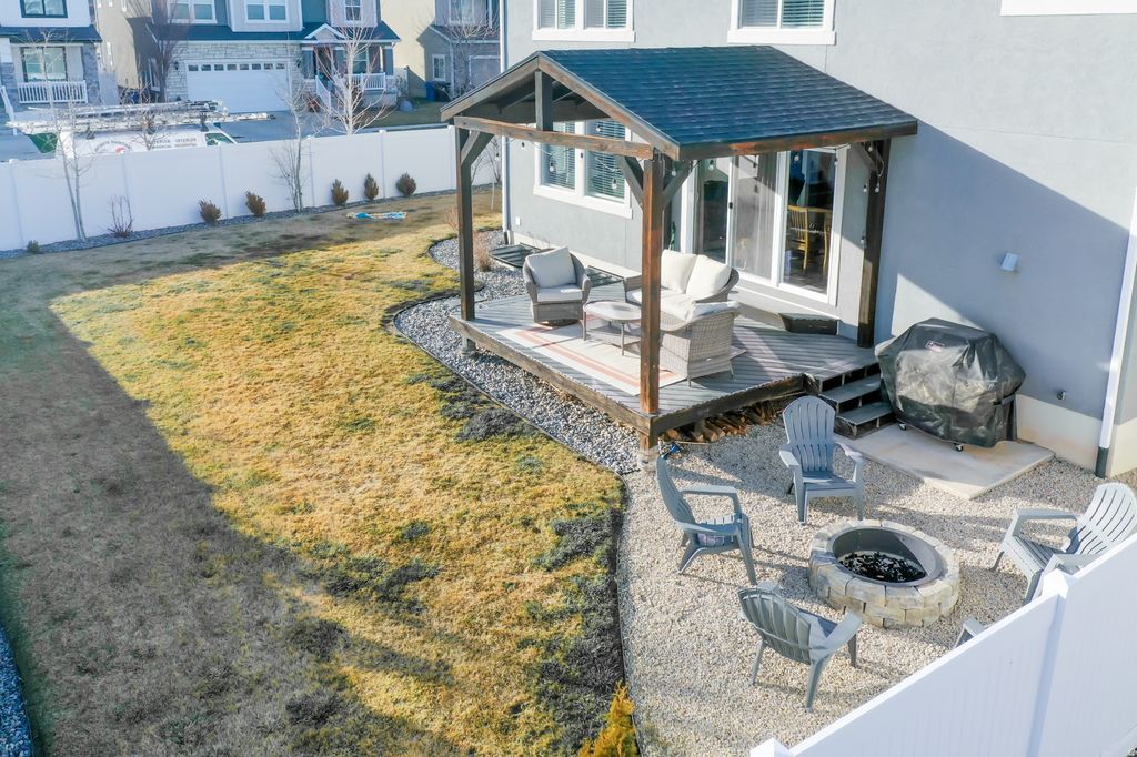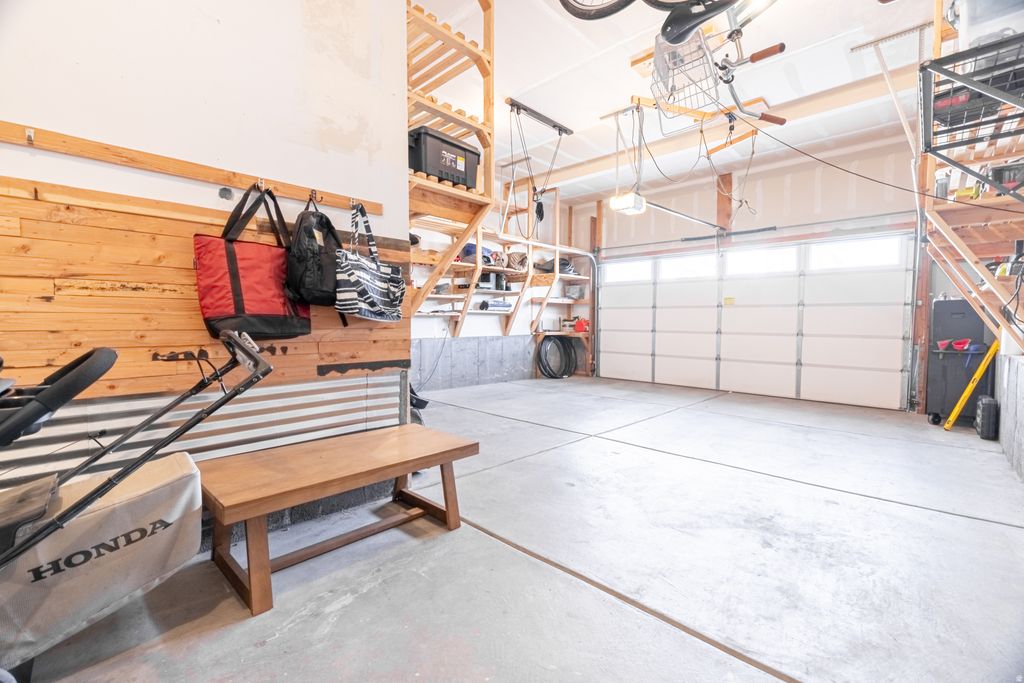 Stunning two-story home on a desirable corner lot in an exceptional neighborhood, offering an impressive array of features. The open-concept layout includes a spacious loft-style family room and breathtaking mountain views. The primary suite boasts a tray ceiling, European-style shower, and a generous walk-in closet. A fully finished basement, water softener, tankless water heater, and abundant storage throughout add both comfort and convenience. Located just five minutes from Herriman Towne Center-yet tucked away from heavy traffic-this home offers the perfect balance of accessibility and tranquility. Enjoy relaxing on the covered deck while taking in the beautiful mountain views. The fully fenced backyard provides added privacy and a great space to host. Additional highlights include an extra-long two-car garage with ceiling-mounted bike hoists and built-in wood shelving-truly storage galore, with no need for a storage unit. The side yard offers potential space for an RV pad. Just a short walk to the neighborhood park, playground, and scenic walking trails, where frequent community events bring neighbors together. NO HOA!